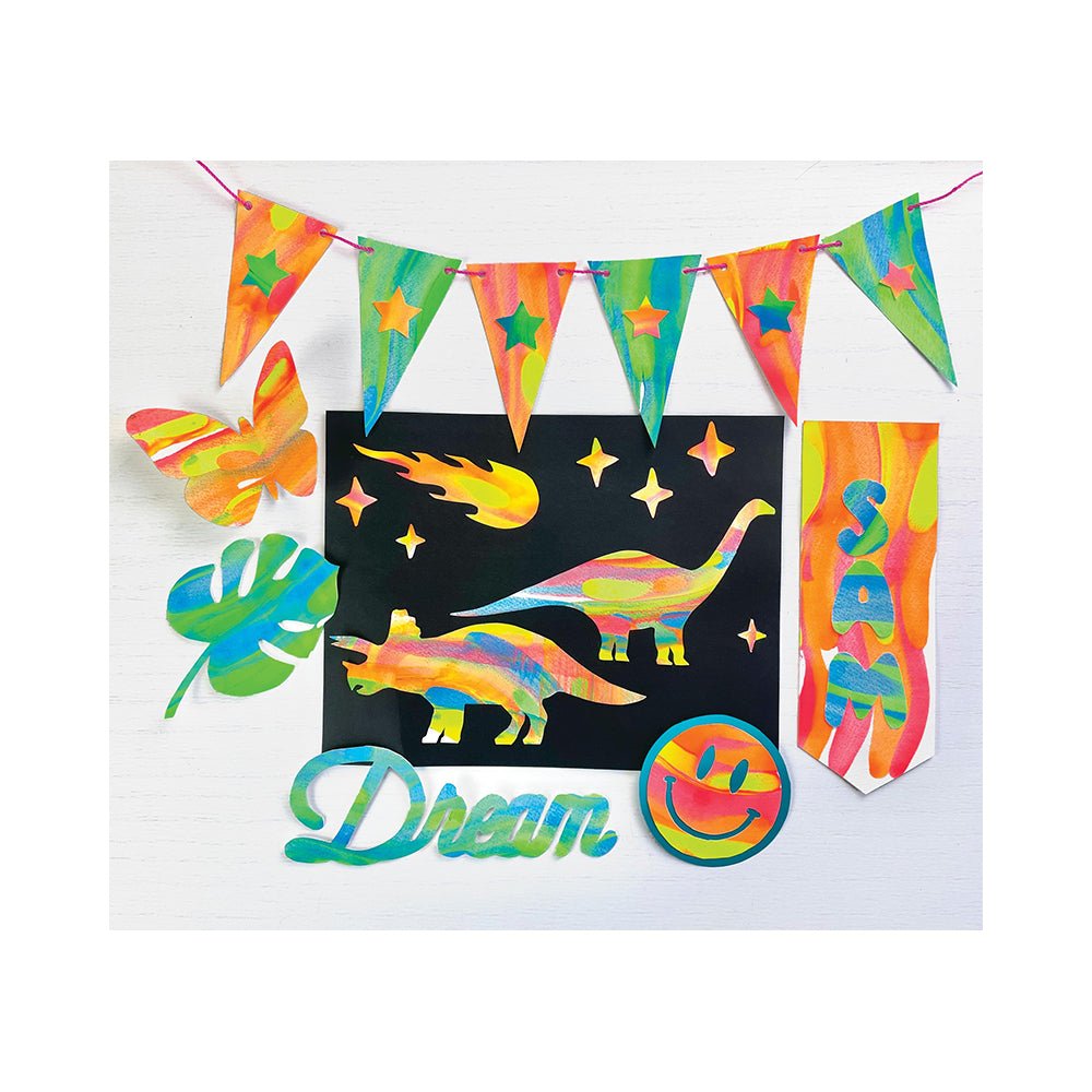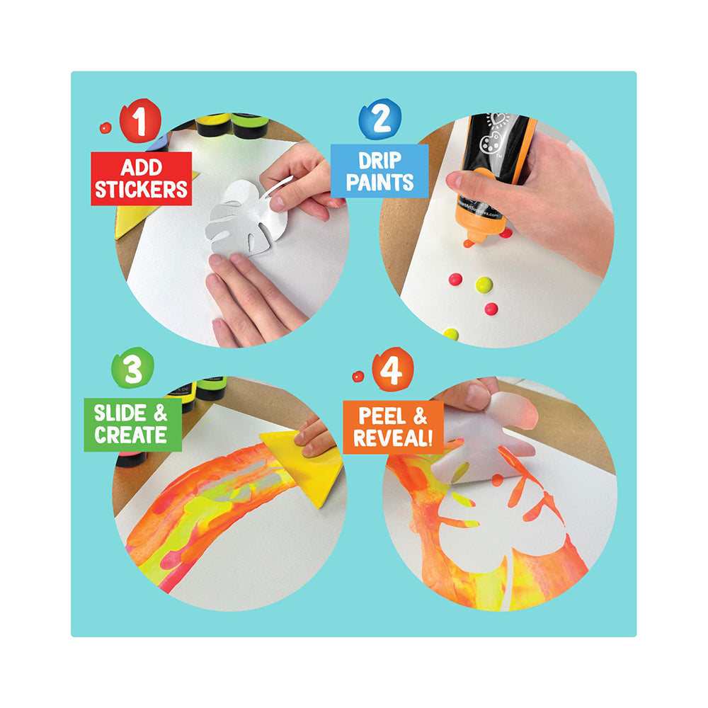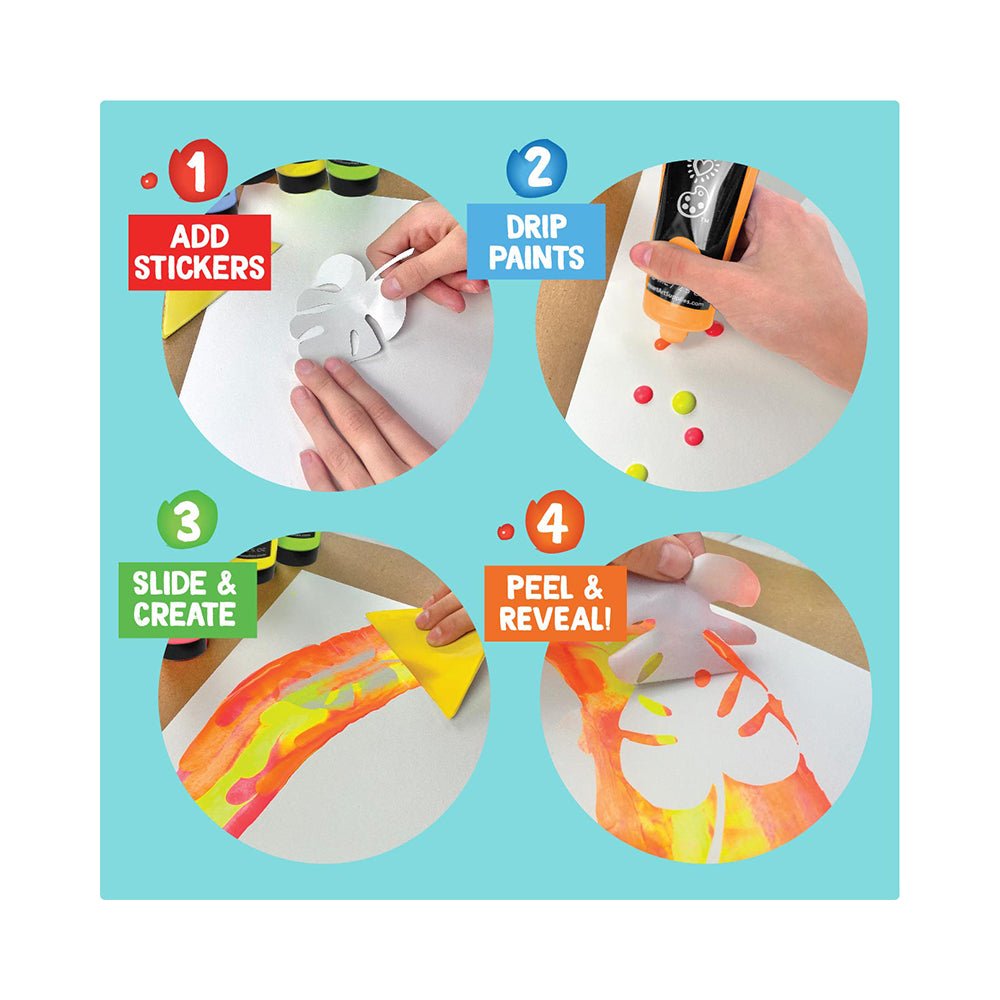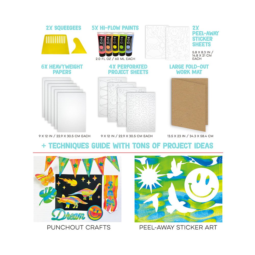 The most fun way to make abstract art! Drip and slide. So many projects inside! Blendable, vibrant neon paints! Includes large fold-out work surface! Drip & slide a modern masterpiece! Comes with 2 squeegees, large work surface, 5 paint tubes, 10 sheets of watercolor paper including kiss-cut projects, sticker sheet to mask off areas, and techniques guide.