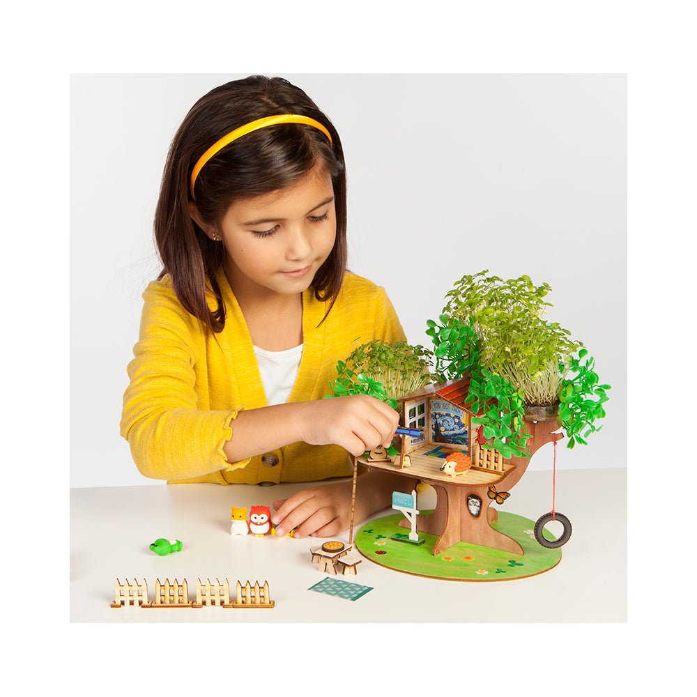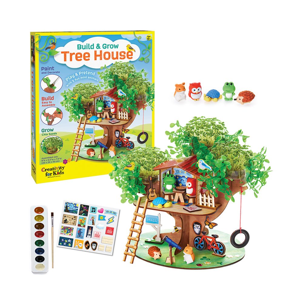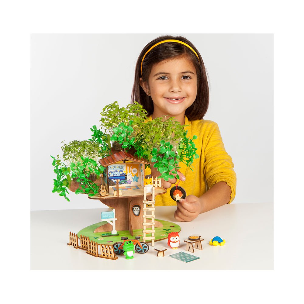 Children will love building, painting, decorating and growing their own wooden tree house. So many fun details included! Miniature wooden accessories come ready to assemble and decorate. Use the included stickers to accent your tree house habitat. Children will love interacting with the play and pretend mini animals included. Accent with faux leaves and bring your tree to life with easy-grow chia seed. Includes soil-free plant medium for less mess.