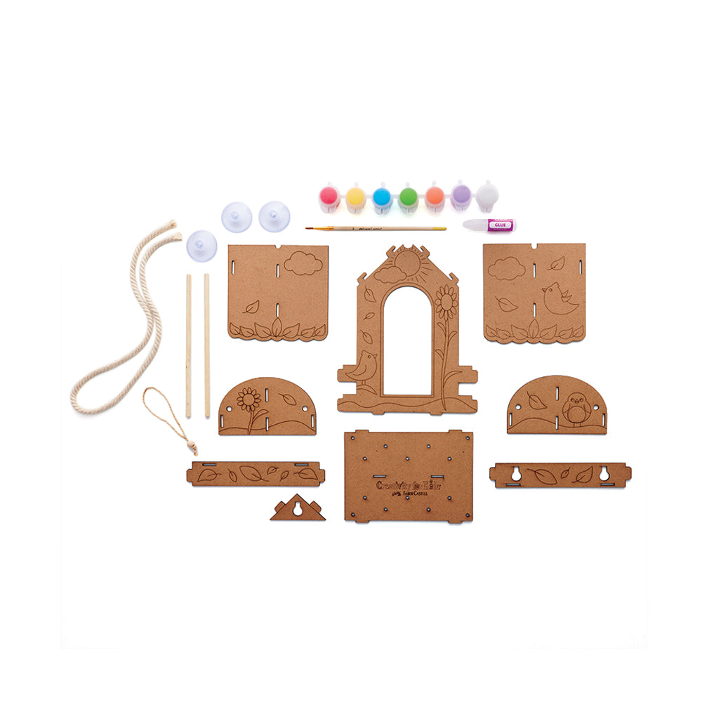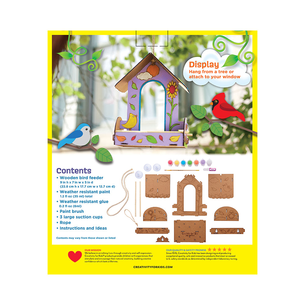 This build and decorate bird feeder, encourages children to connect to nature through the hobby of backyard birding. Our high-quality wooden bird feeder is easy to assemble and fun to personalize. Weather resistant paint features a nature inspired palette. Fill the base of the feeder and see who comes to perch and enjoy their new dining destination. Birdseed NOT included. Match the birds that visit your feeder to the bird identifier poster included.