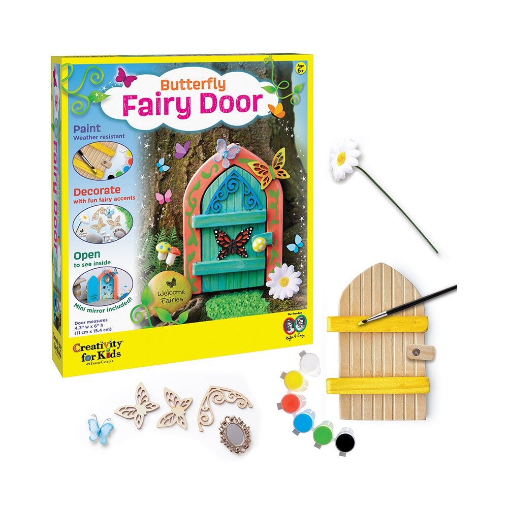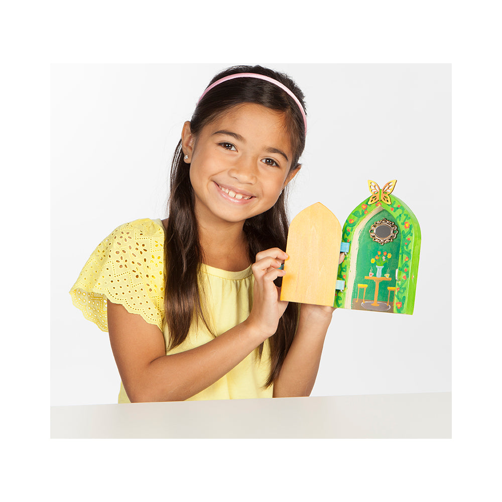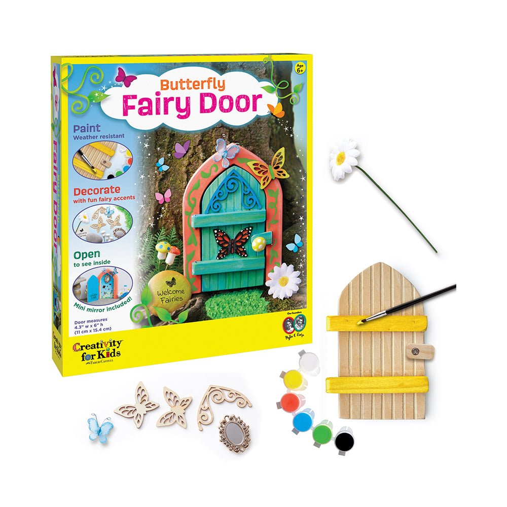 Fairy doors and fairy villages are popping up everywhere. This fun activity makes a great family craft and hobby.Beautiful wooden fairy door, comes ready to decorate with weather resistant paint, butterflies, and plenty of fairy accessories including a welcome rock, gravel path, faux mushrooms and a flower. Open the door and decorate the inside too with the decorative mirror included. Hang it on a tree or in your favorite fairy hiding place.