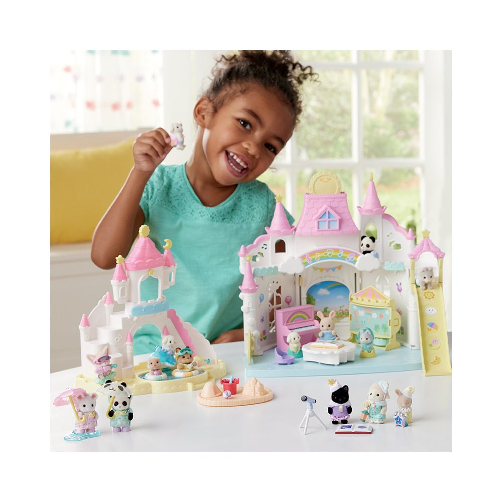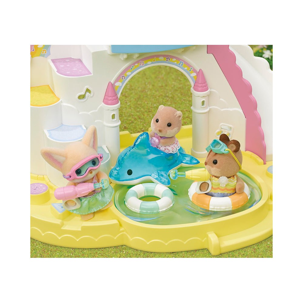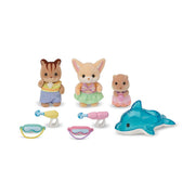 Contains three babies. The inflatable dolphin and pool toys provide lots of fun in the pool. Cradled babies can ride the inflatable dolphin. The babies are wearing cute swimming costumes with wave patterns and shell buttons. The babies can hold the pool toys and wear the goggles. The Fennec Fox baby is Yulie, the Walnut Squirrel baby is Ambrose and the Splashy Otter cradled baby is Nicola. Combine with Sunny Castle Nursery, Rainbow Fun Nursery Bus, Nursery Swing, Nursery Sandbox & Pool and Flora Rabbit Family (sold separately) for even more fun. Combine with baby and cradled baby figures (sold separately) for even more fun, imaginative playtime!