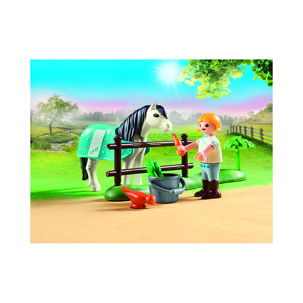 Explore fun riding adventures with the Collectible Classic Pony. First, the girl and her pony enjoy a pleasant ride in their color-coordinated accessories. Then, the rider cleans and brushes out the pony's coat. Once finished, she can store all the grooming tools in the aqua basket while the pony munches at the grass and carrot in the bucket. Play with this set on its own or combine it with the rest of the PLAYMOBIL Pony Farm world (#70510-70516, 70682-70683, 70518-70523 - each sold separately) for even more fun. Set includes one figure, one pony, horse blanket, basket with grooming tools, fence section, bird, and other accessories. Recommended for ages four to ten years.