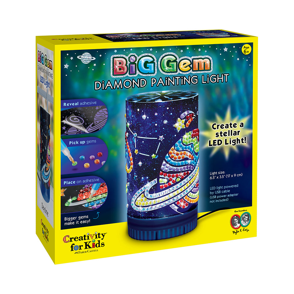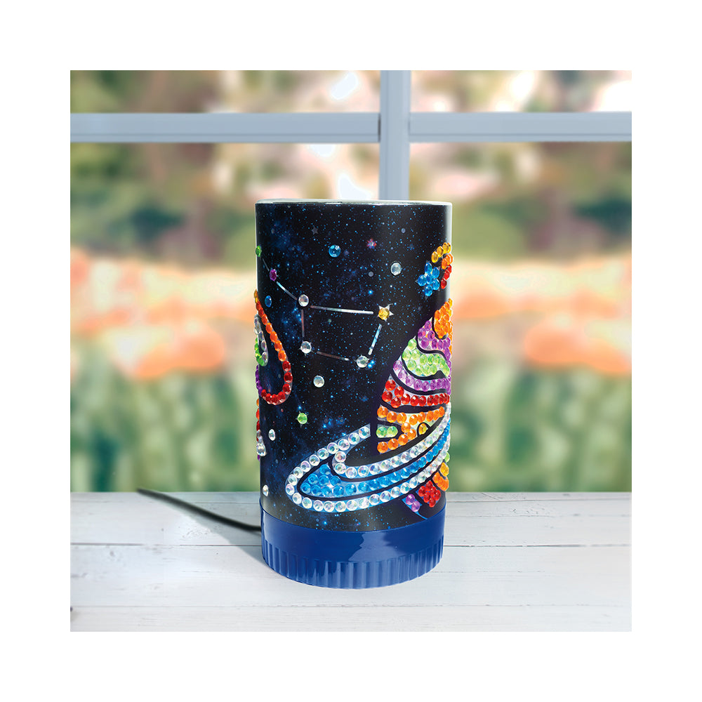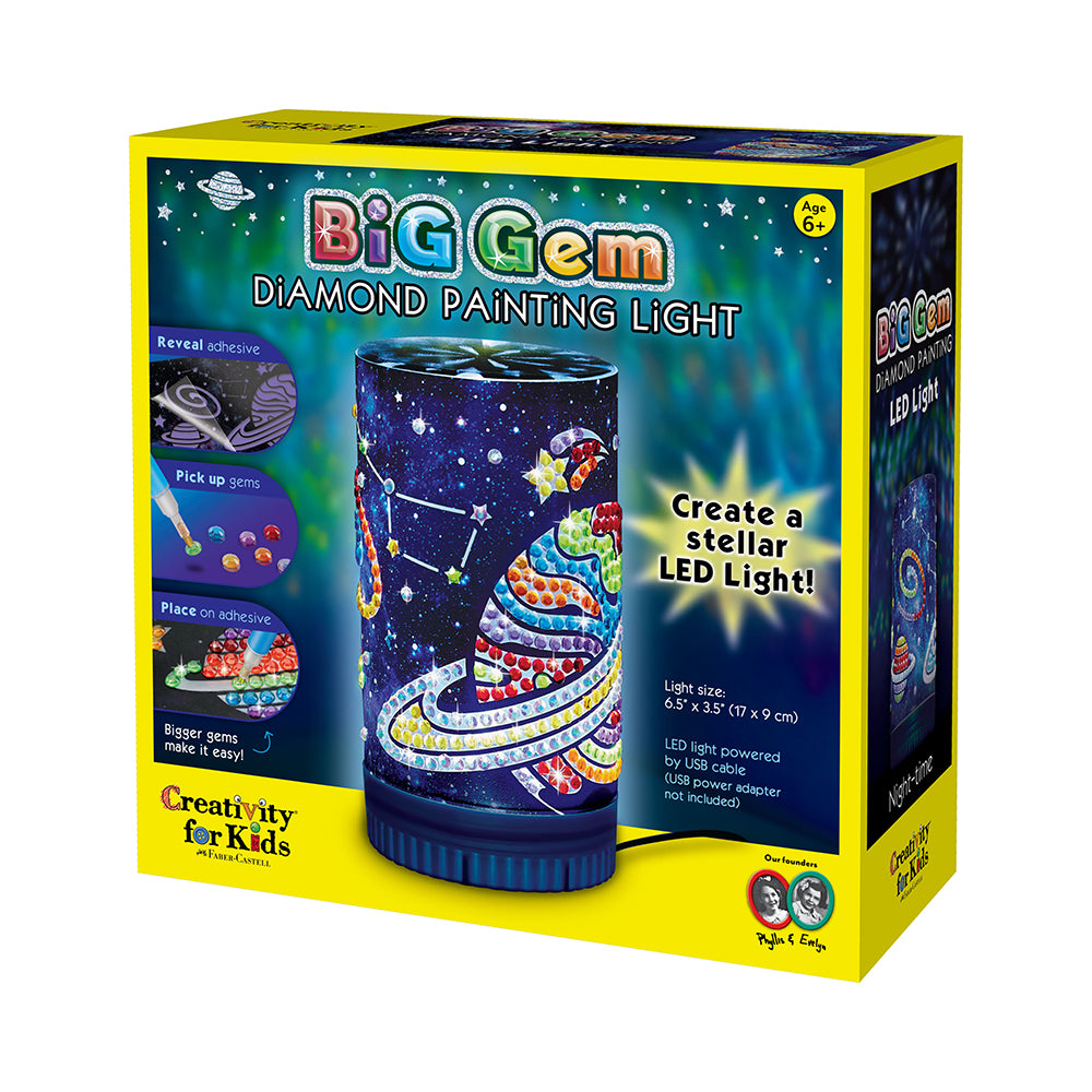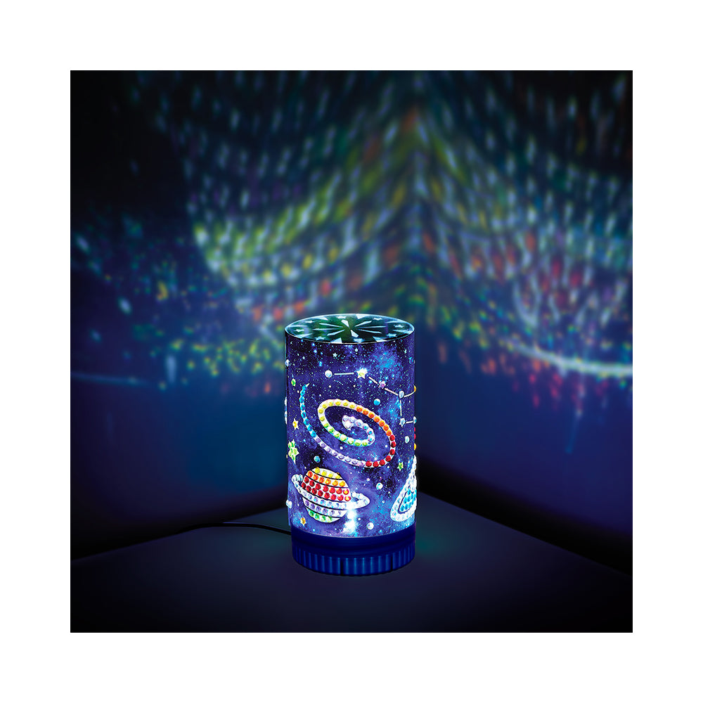 Diamond painting made simple! Stellar light-up art offers open-ended diamond painting fun. Create YOUR way. No glue needed. A great fine motor activity. Peel the clear cover off the design to reveal the adhesive; then place colourful, transparent gems. Cast radiating light patterns on the ceiling with two fun shadow disks. USB cord with integrated on/off switch powers your light.