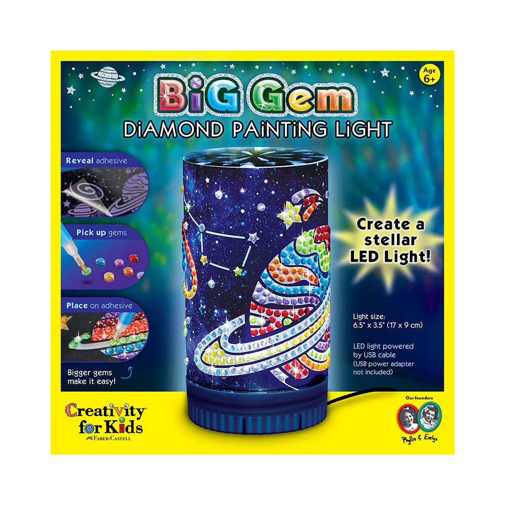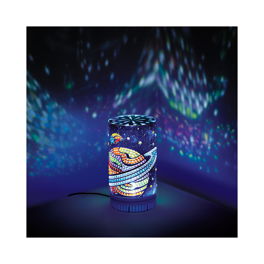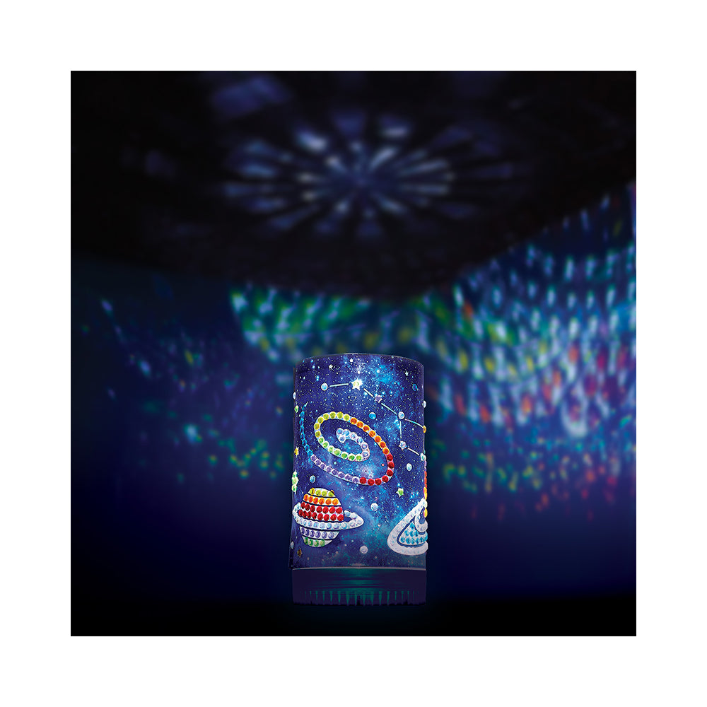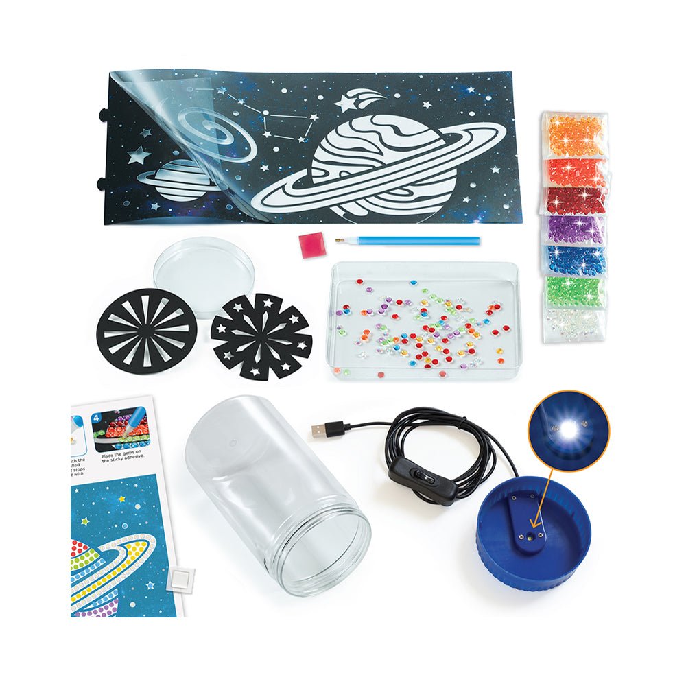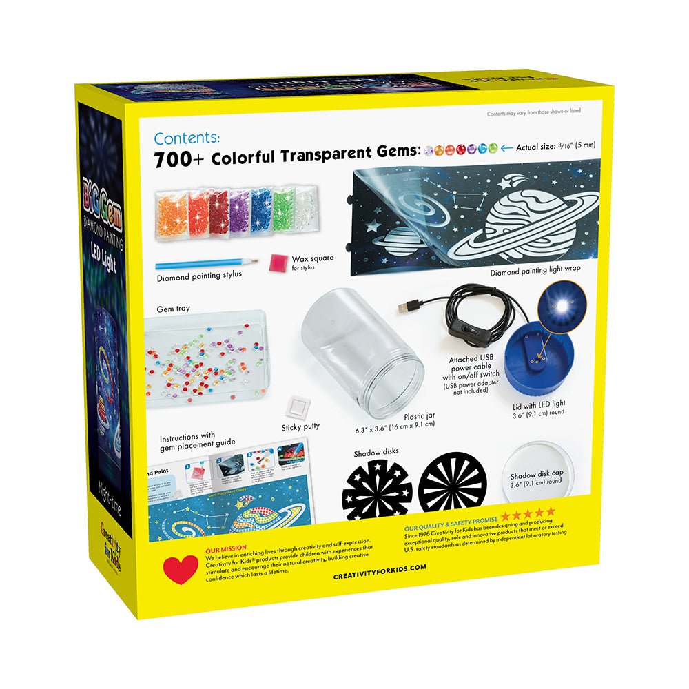Diamond painting made simple! Stellar light-up art offers open-ended diamond painting fun. Create YOUR way. No glue needed. A great fine motor activity. Peel the clear cover off the design to reveal the adhesive; then place colourful, transparent gems. Cast radiating light patterns on the ceiling with two fun shadow disks. USB cord with integrated on/off switch powers your light.