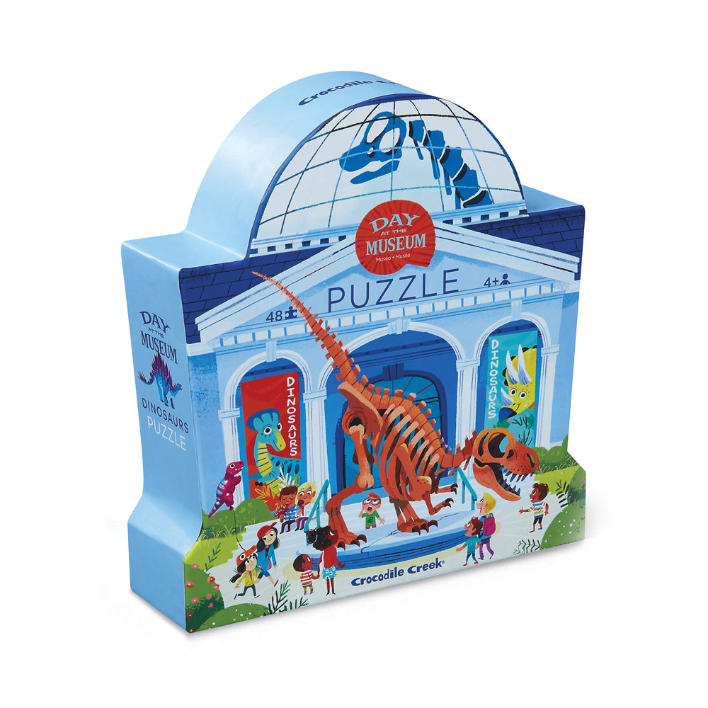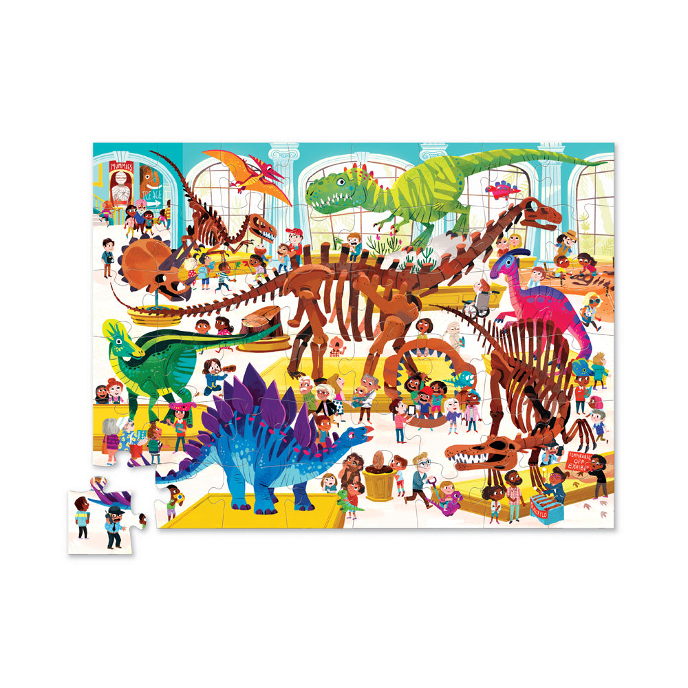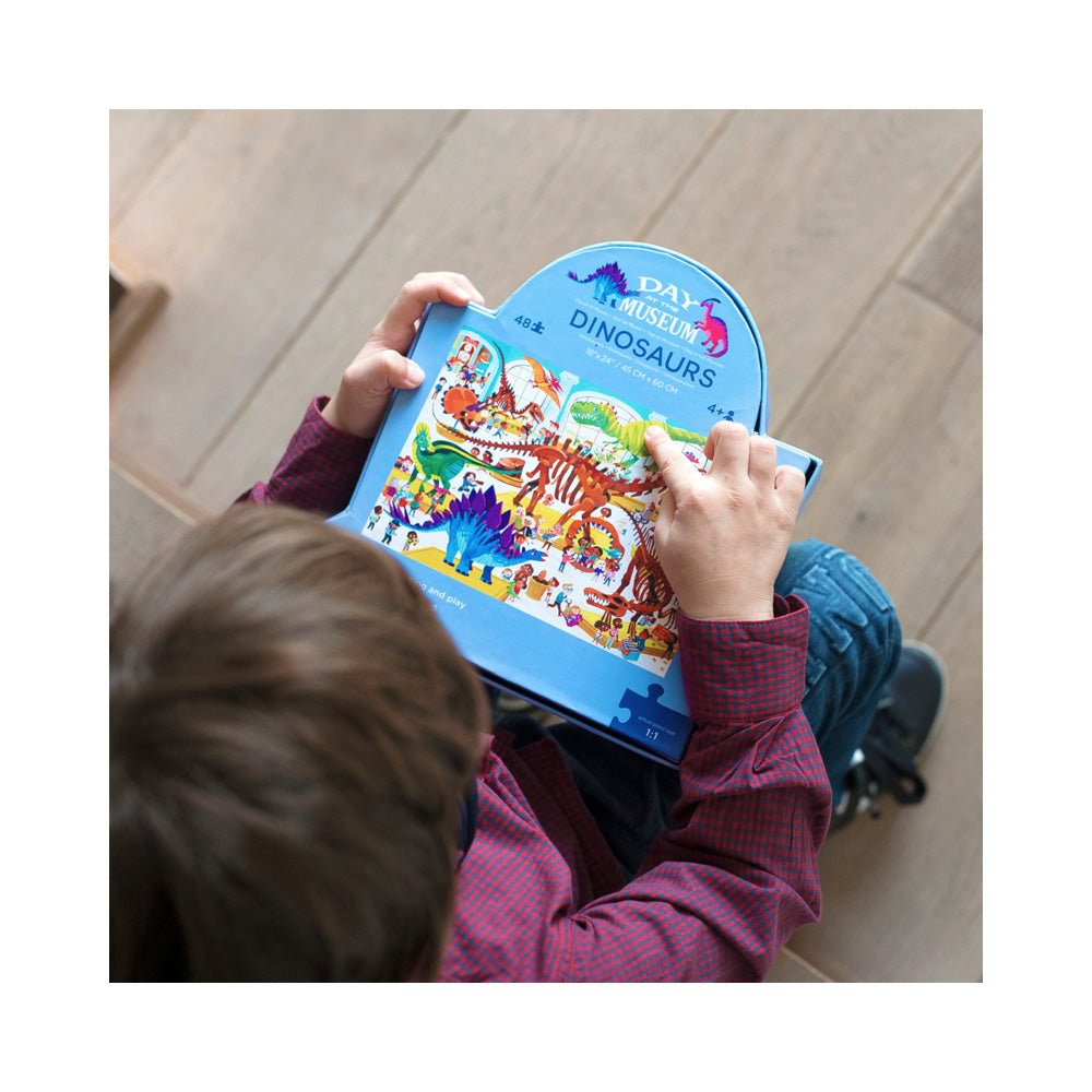 Day at the Museum Dinosaur 48-piece puzzle is a fun and whimsical observation puzzle that transports players to a natural history museum filled with dinosaurs and other museum exhibits. It's designed for ages 4+, encourages hand-eye coordination and problem-solving skills, and is made with soy-based inks on recycled cardboard. The finished puzzle measures 18" x 24" and comes in a uniquely shaped box for storage