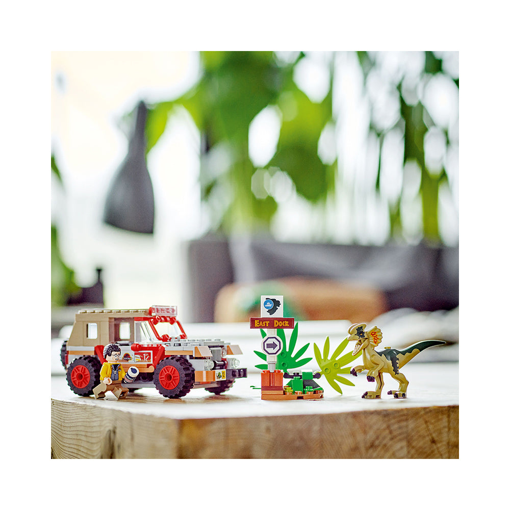 Youngsters can recreate a classic Jurassic Park scene and play out their own stories with this collectible LEGO Jurassic World Dilophosaurus Ambush (76958) toy building set.