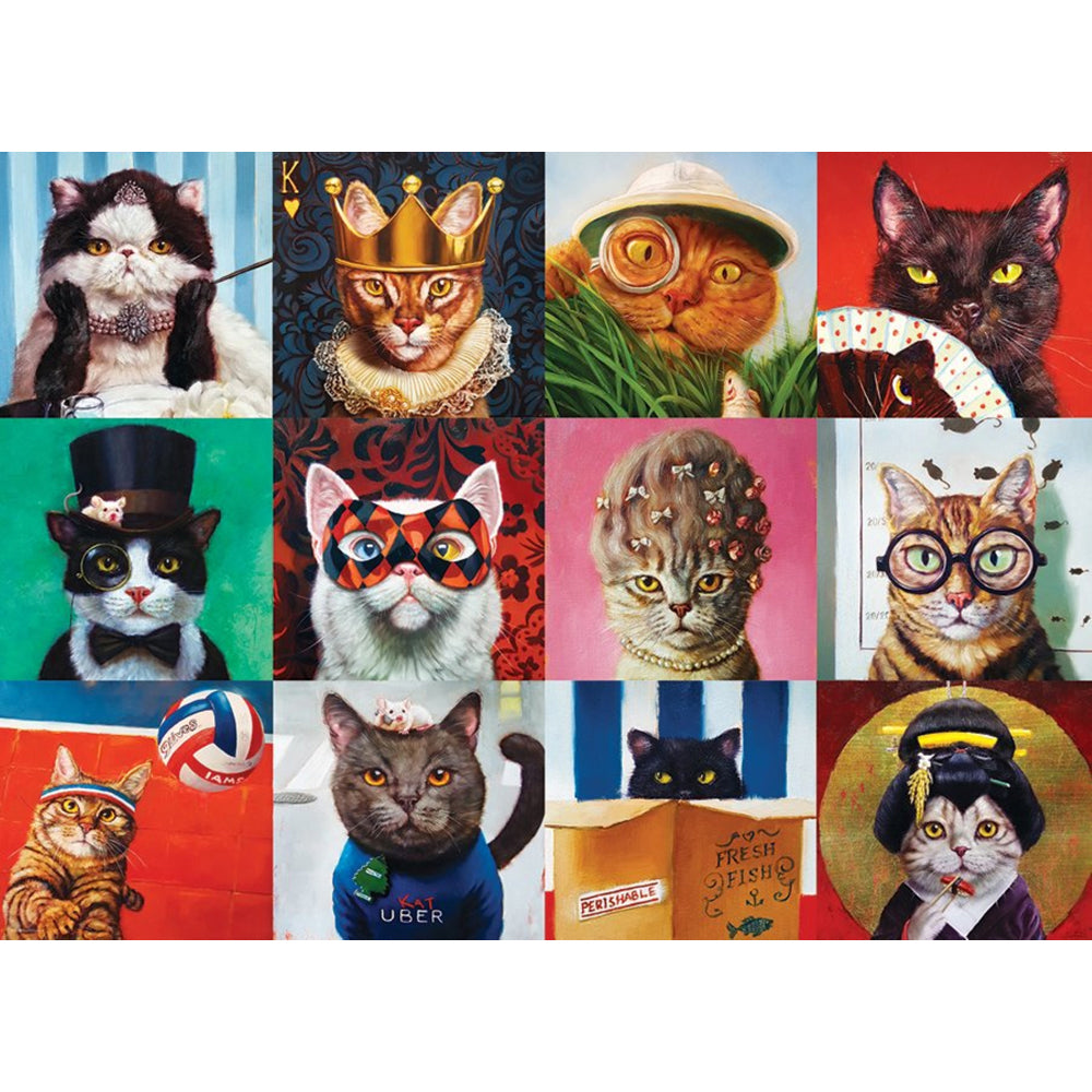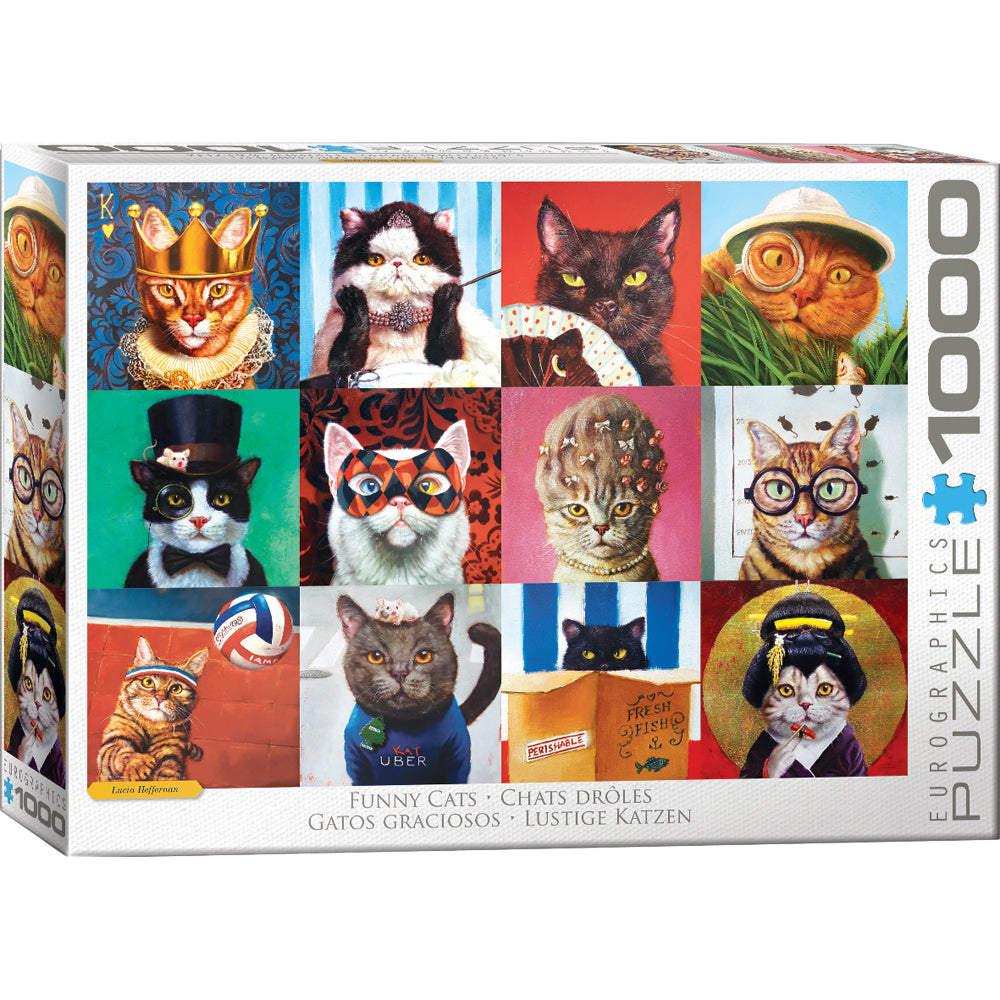 Eurographics Funny Cats 1000-Piece Puzzle. This colorful puzzle measures 19.25 x 26.6 in (48.89 x 67.56 cm) completed. Box size: 10 x 14 x 2.37 in (25.4 x 35.36 x 6 cm). Artist Lucia Heffernan. Twelve different feline portraits collage. This collision between animal and human sensibilities creates a whimsical, theatrical, and often humorous world that viewers can relate to on an emotional level. Strong high-quality puzzle pieces. Made from recycled blue board paper and printed with vegetable based ink.