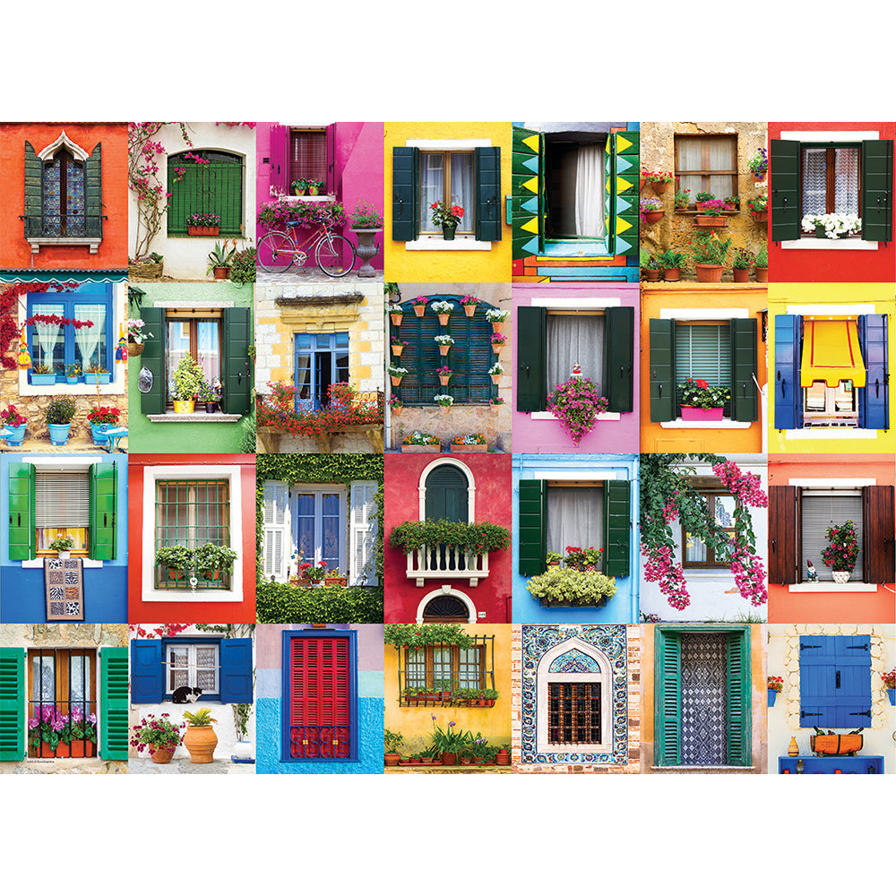 EuroGraphics Mediterranean Windows 1000-Piece Puzzle. Box size: 10" x 14" x 2.37". Finished Puzzle Size: 19.25" x 26.5". Expressions are abound as each window shows the unique personality of who lives within those windows. Strong high-quality puzzle pieces. Made from recycled board and printed with vegetable based ink.