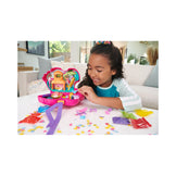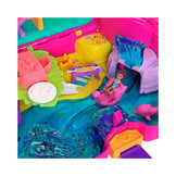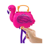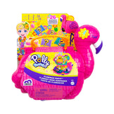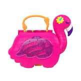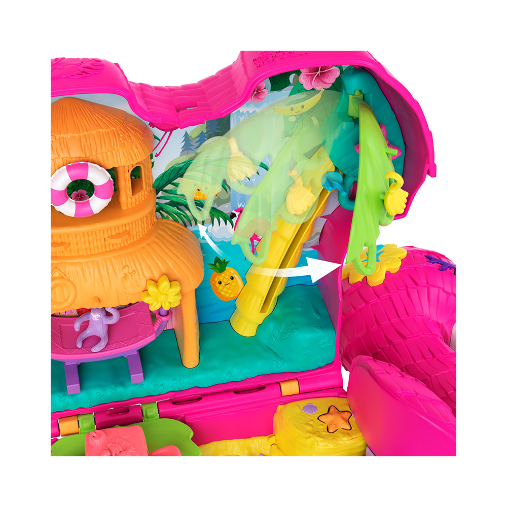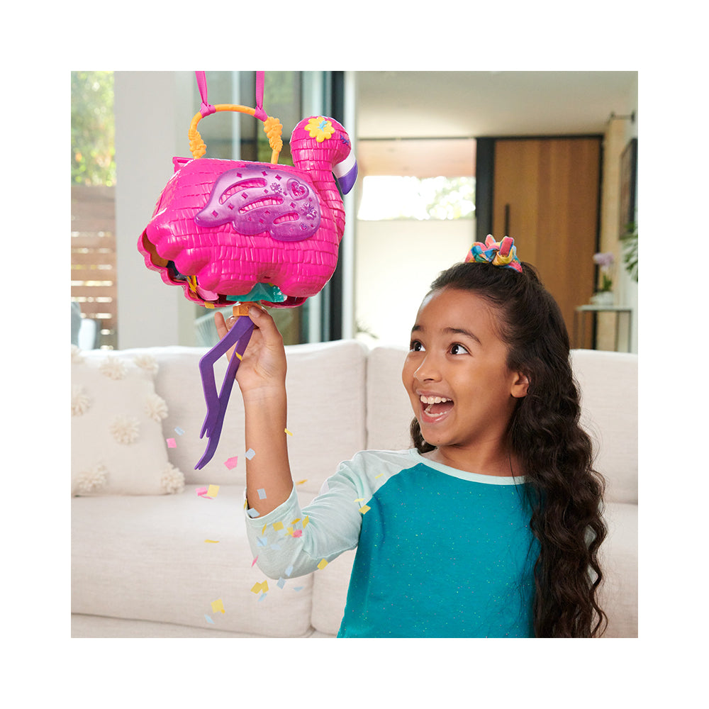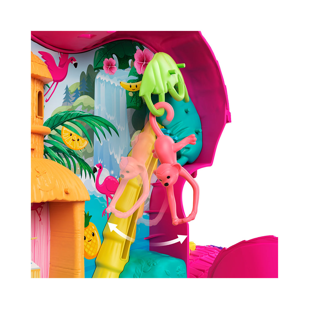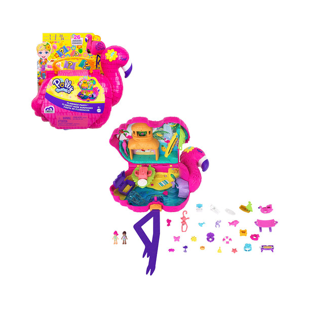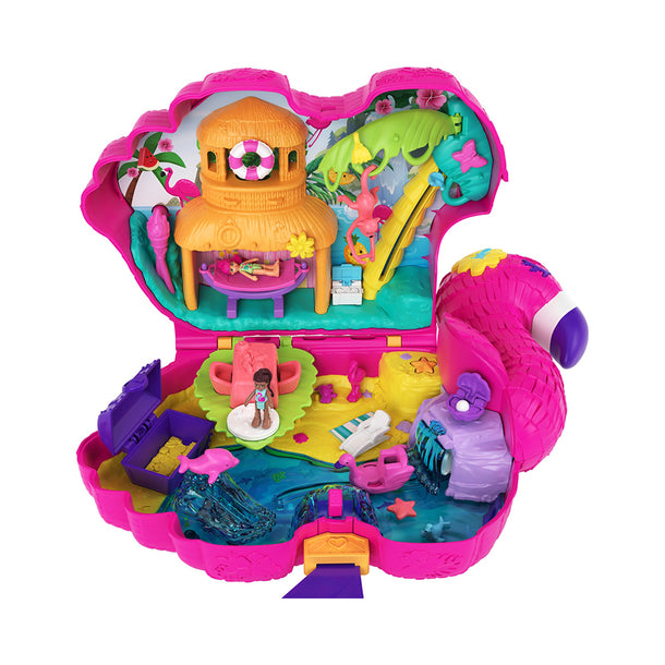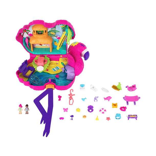 Get ready for tropical party fun with the Polly Pocket™ Flamingo Party™ playset! Shaped like an adorable flamingo, this larger-sized compact also has a handle for portable play. Pull the leg tabs and watch the colorful stream of confetti and 26 surprises fall from the playset. Some surprises are wrapped to save for later or to unwrap right away! Many surprises have a Pop & Swap™ feature that lets kids peg the pieces into different areas of the compact. The playset opens to reveal a fun tropical adventure with micro Margot™ and friend dolls. There are so many fun things to do and explore: clip a doll on the palm tree trunk to climb up and down; clip the monkey on the tree and the doll can clip to the monkey and swing; flip the big leaf on the hut to reveal a banquet and spinning dance floor; the treasure chest opens to reveal storage; peg Pop & Swap™ accessories on the hut roof, treetop, beach and water; attach surfboard, flamingo floatie and dolphin onto the wave and more.