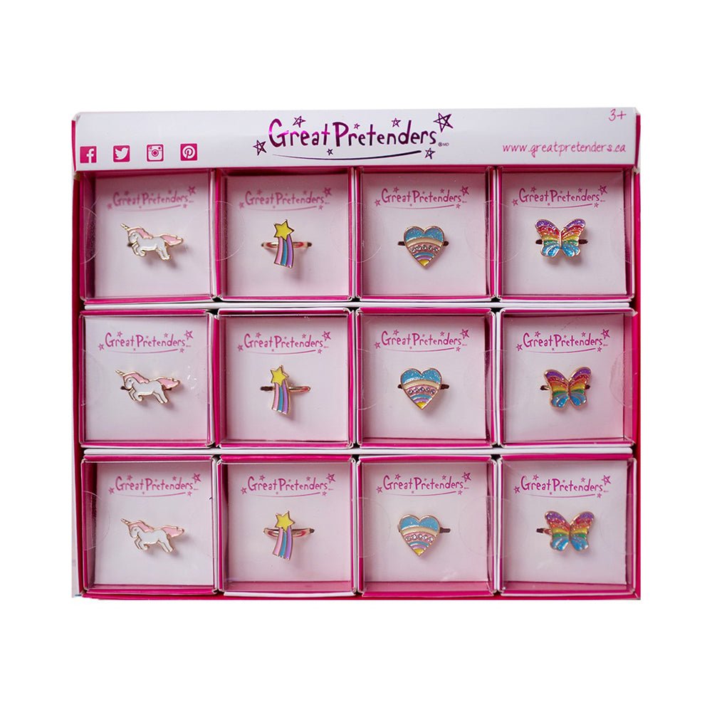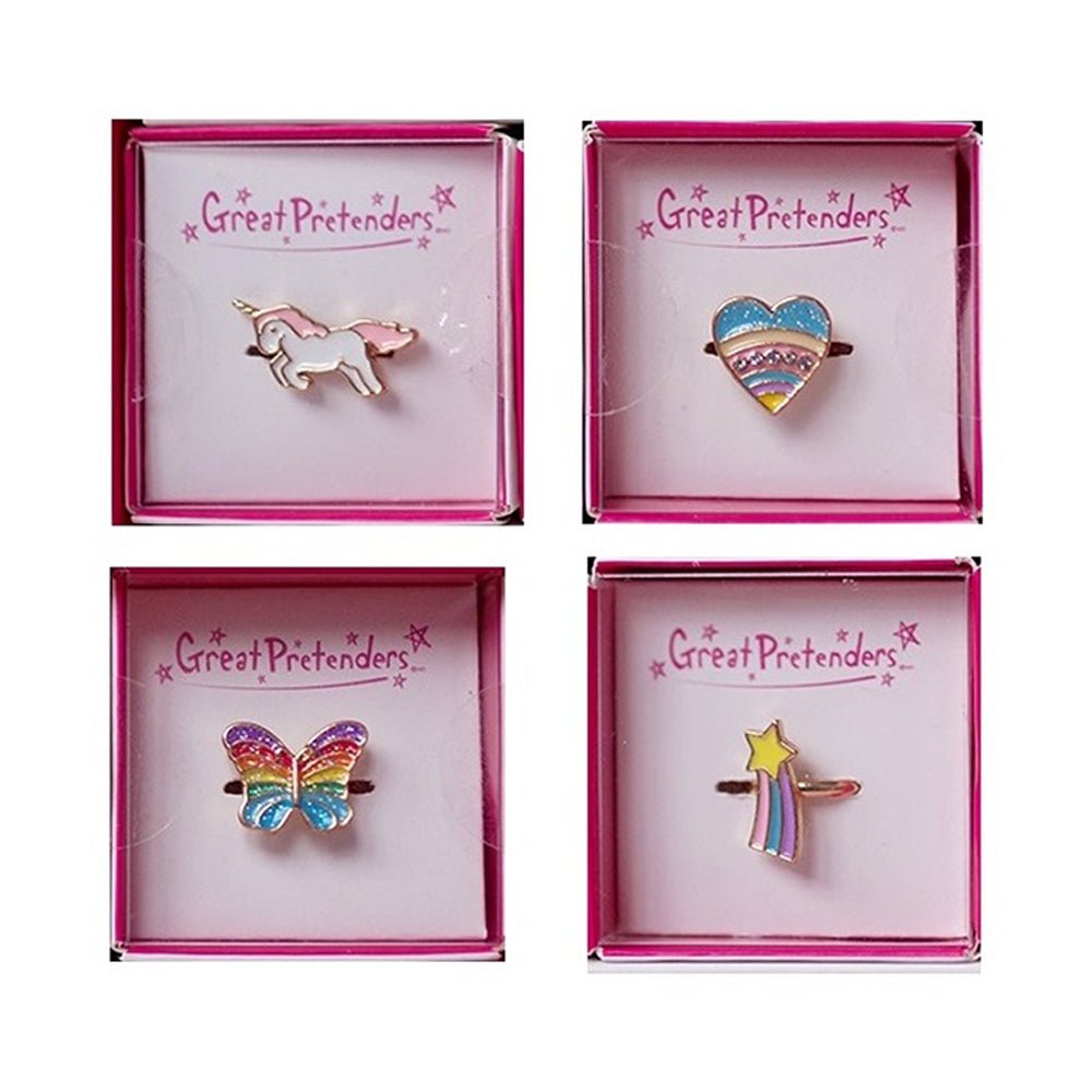 These adorable and adjustable rings come in four charming designs: a unicorn, a shooting star with a rainbow, a gem studded rainbow coloured heart, and a rainbow coloured butterfly! Very cute golden metallic rings, they sparkle, they glitter, and they shine! They are the must-have accessory for all little ones! Each ring is sold separately. Random style will ship!