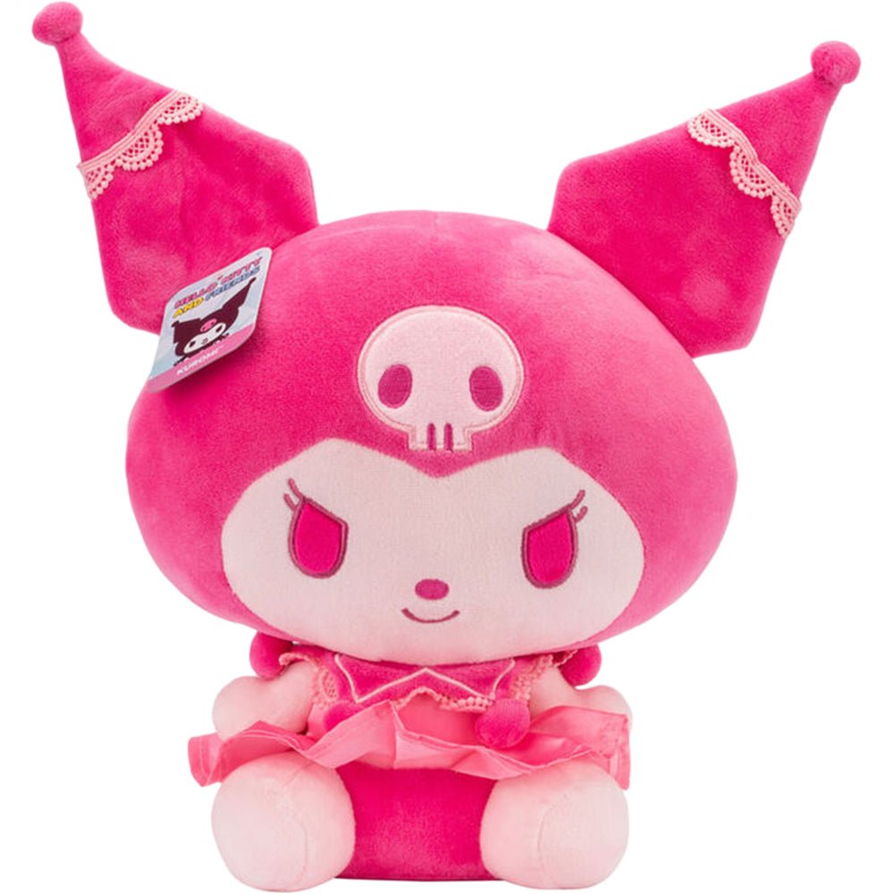 Kuromi is ready to charm you with her new pink makeover! This 12-inch plush features a unique pink monochrome design complete with kawaii fashion. Kuromi brightens her look with lace detailing on her jester's hat and collar, a pleated skirt, and glitter stitching around her skull icon. With four fan-favorite characters, the Pink Monochrome Plush collection is enough to make any Sanrio collector blush! Pair Kuromi with her BFFs Hello Kitty, My Melody, and Cinnamoroll, to complete your collection.