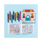 8 bright crayon friends + a 60-page coloring book with rooms & fun activities! House-shaped coloring book!