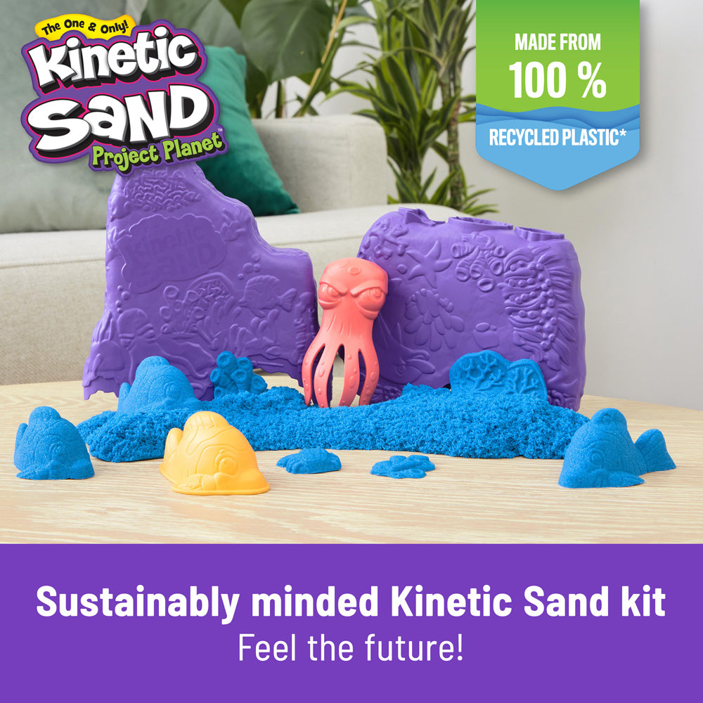 This Kinetic Sand kit will spark imagination as kids mold, flow, stamp and build a coral garden. Project Planet is Kinetic Sand's line of eco friendly sustainably minded toys, made using 100% ocean-bound recycled plastics.??