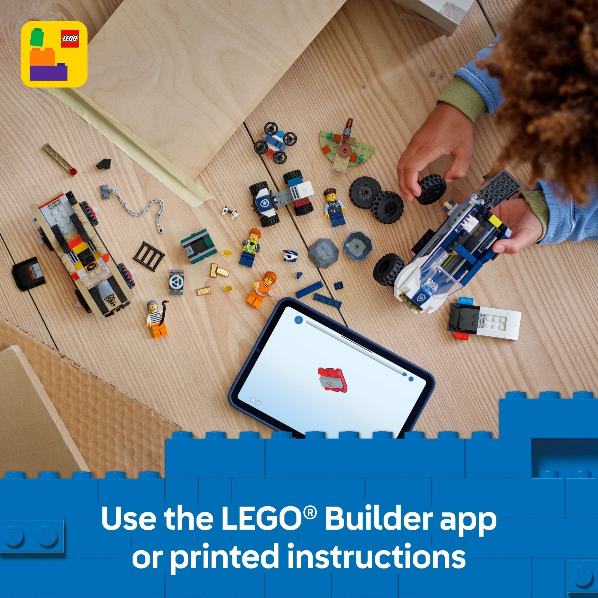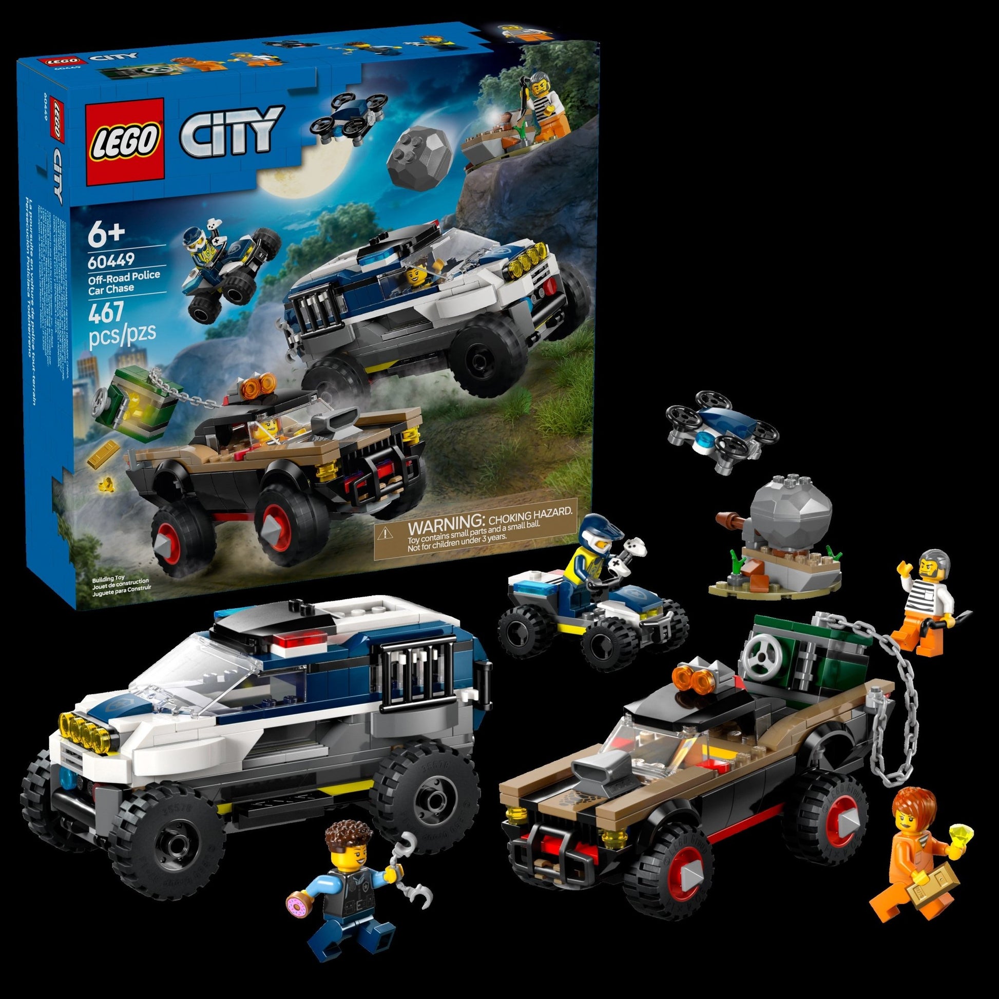 Designed for ages 6 and up, this fun playset features a police SUV, quad bike and drone, plus a crook's muscle pickup truck and a stolen safe full of toy gold bars and diamonds. Just add the 2 police officers, 2 crooks and a rolling-boulder ambush for hours of action-packed adventures. This police toy building set includes a printed building guide and step-by-step digital instructions in the LEGO Builder app - a digital building companion with intuitive zoom and rotate tools that enable kids to visualize models from all angles as they build. LEGO City toys feature cool vehicles, realistic structures and fun characters that inspire limitless creativity. Kids can add this LEGO City set to others (sold separately) from the LEGO City range to expand the world of play possibilities. Contains 467 pieces.