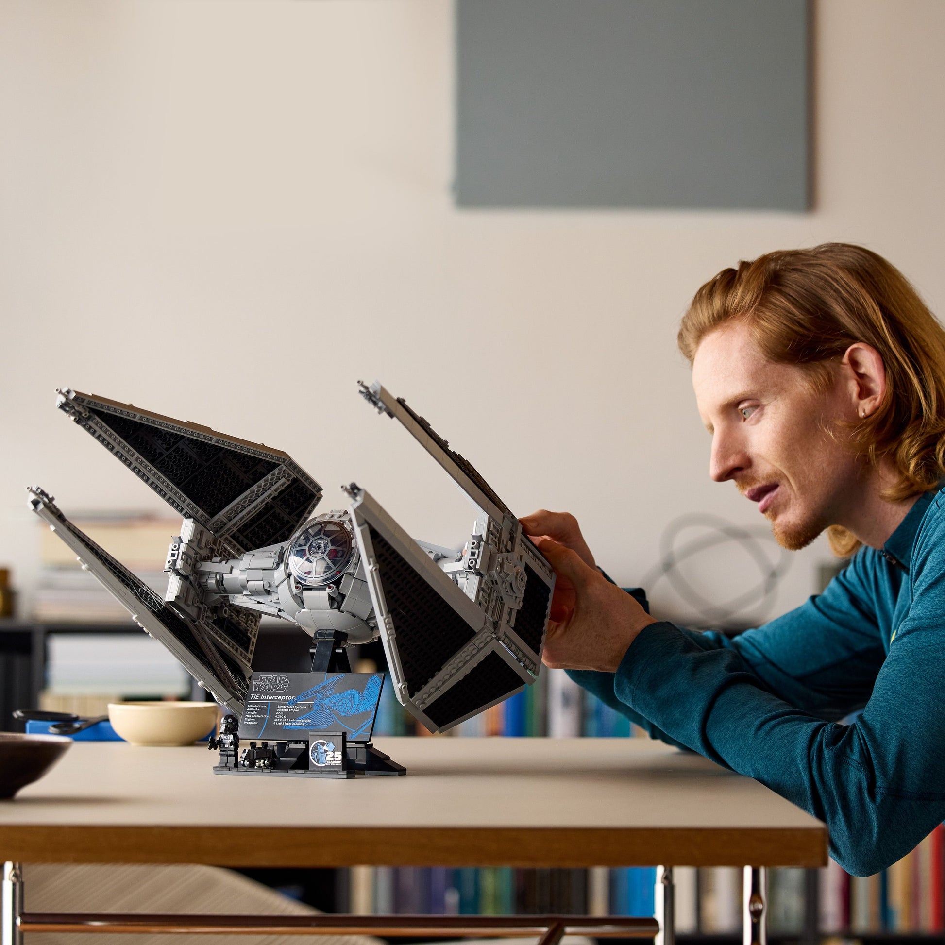 The iconic TIE Interceptor starfighter was part of the first-ever launch of LEGO Star Wars UCS sets in the year 2000; now it's back and redesigned for even greater authenticity. Revel in buildable details, such as its distinctive wings, cockpit interior, laser cannons and rear engine. This collectible brick-built vehicle measures over 40 cm (16 in.) long and has a display stand with an information plaque, a LEGO Star Wars 25th anniversary brick and space for the included TIE Pilot LEGO minifigure and LEGO mouse droid figure. This creative building kit is part of a collection of LEGO Star Wars sets (sold separately) that offer relaxing activities for adults. It comes with step-by-step instructions, and you can also check out the LEGO Builder app for zoom and rotate viewing tools to assist you with the complex, immersive and rewarding build.