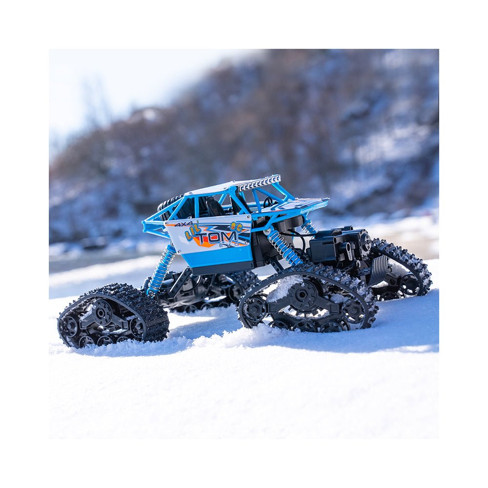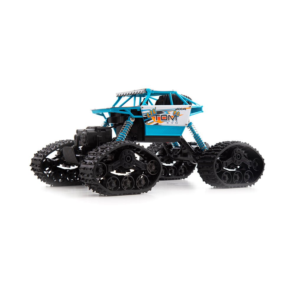 Equipped with a heavy duty roll cage that protects components in case of a roll over! Easily tackle your next adventure Off-Road with confidence - LIL' TOM SC EVO can handle any challenge. Raining outside? Swap or the tracks for the included wheels and tires andá LIL' TOM SC EVO is very happy zooming across floors in your home.