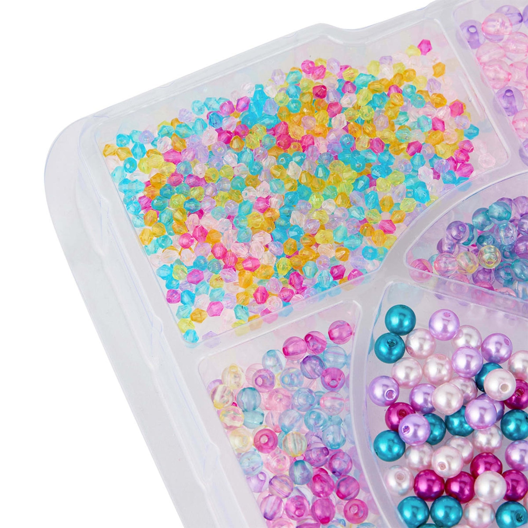 Set includes transparent round beads 70g, alphabet square beads 10g, alphabet round beads 5g, shaped alphabet charms 10g, crystal beads100g, pearl round beads 35g, 5 bulky round beads, 2 elastics, 5 star beads, 1 sticker sheet, and 1 reusable storage case. Suitable for ages 6+ years. Follow instructions carefully.