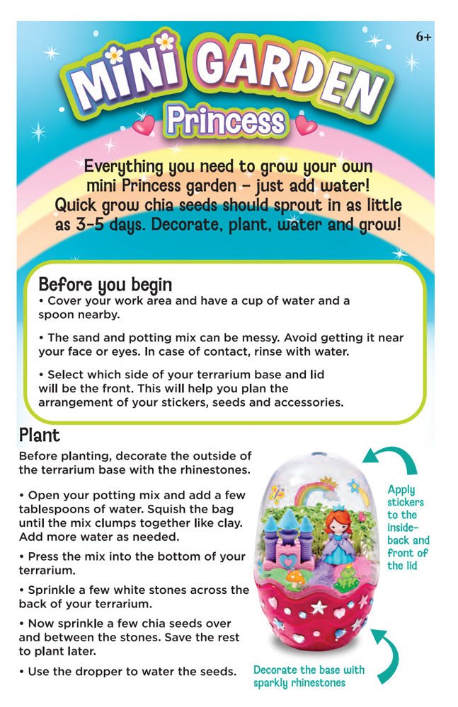 Complete with everything you need to grow your own mini garden, each kit includes potting mix, quick growing chia seeds, themed stickers, adorable mini figures and decorative sand. Easy to grow chia seeds start sprouting in 3-5 days.