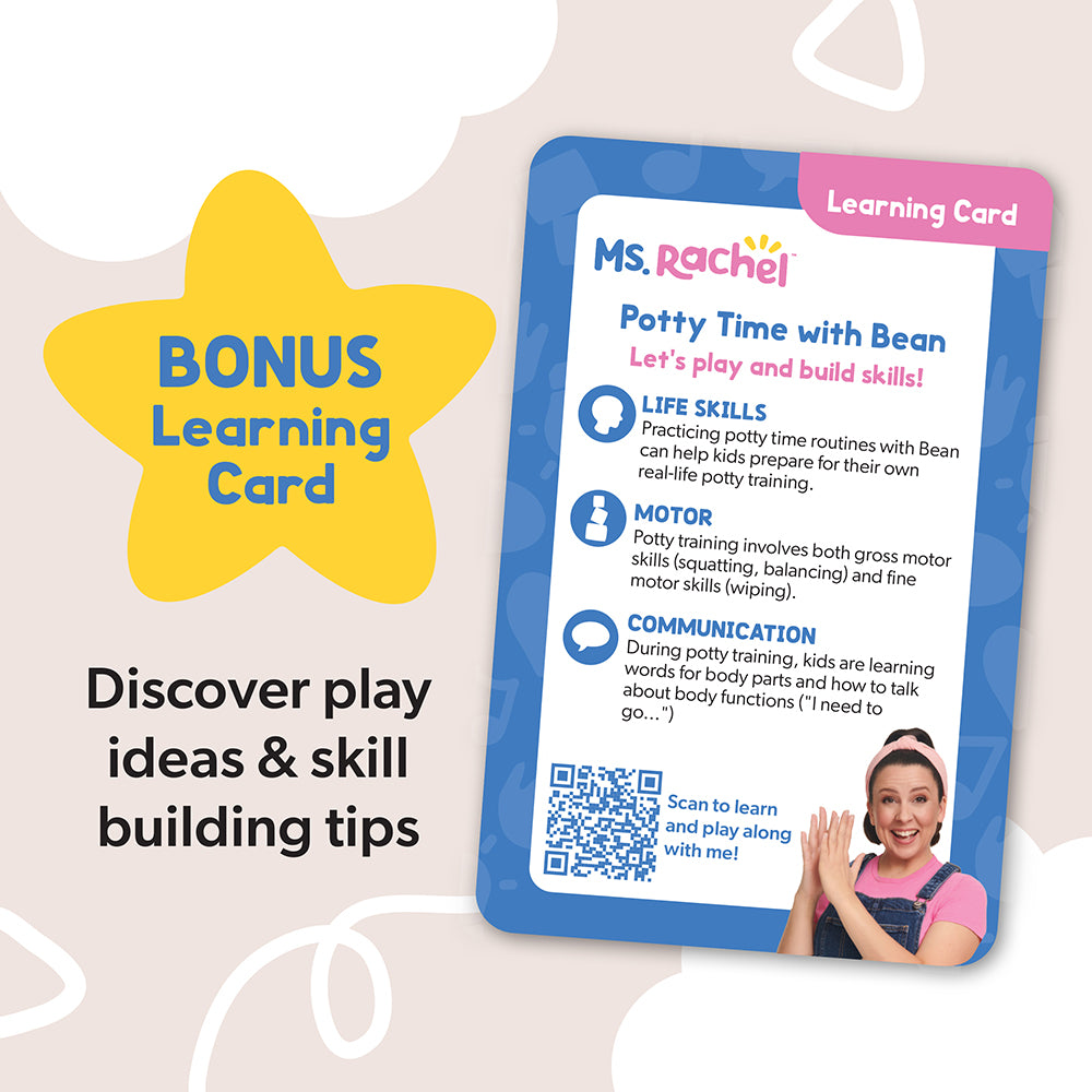 Make potty training fun, approachable, and interactive with the Ms. Rachel Potty Time with Bean set! Join Ms. Rachel’s friend Bean, an adorable teddy bear plush, as he learns potty skills using his own play toilet with reversible flap for #1 and #2. The set includes play toilet paper, a detachable diaper, and felt accessories like a banana, sippy cup, and soap to encourage fine motor skill development. The visual chart guides little ones through potty steps, and comes with an included sticker sheet. Plus, the bonus learning card offers helpful tips and activities to keep learning fun and engaging! This 100% BPA-free toy is designed by Ms. Rachel and developmental experts to support all children, through their ages and stages, from 18+ months. These are ideal newborn toys, toddler toys, preschool toys, and toys for ages 2-4. From baby shower gifts to baby essentials, these products help families learn, bond, and thrive.
