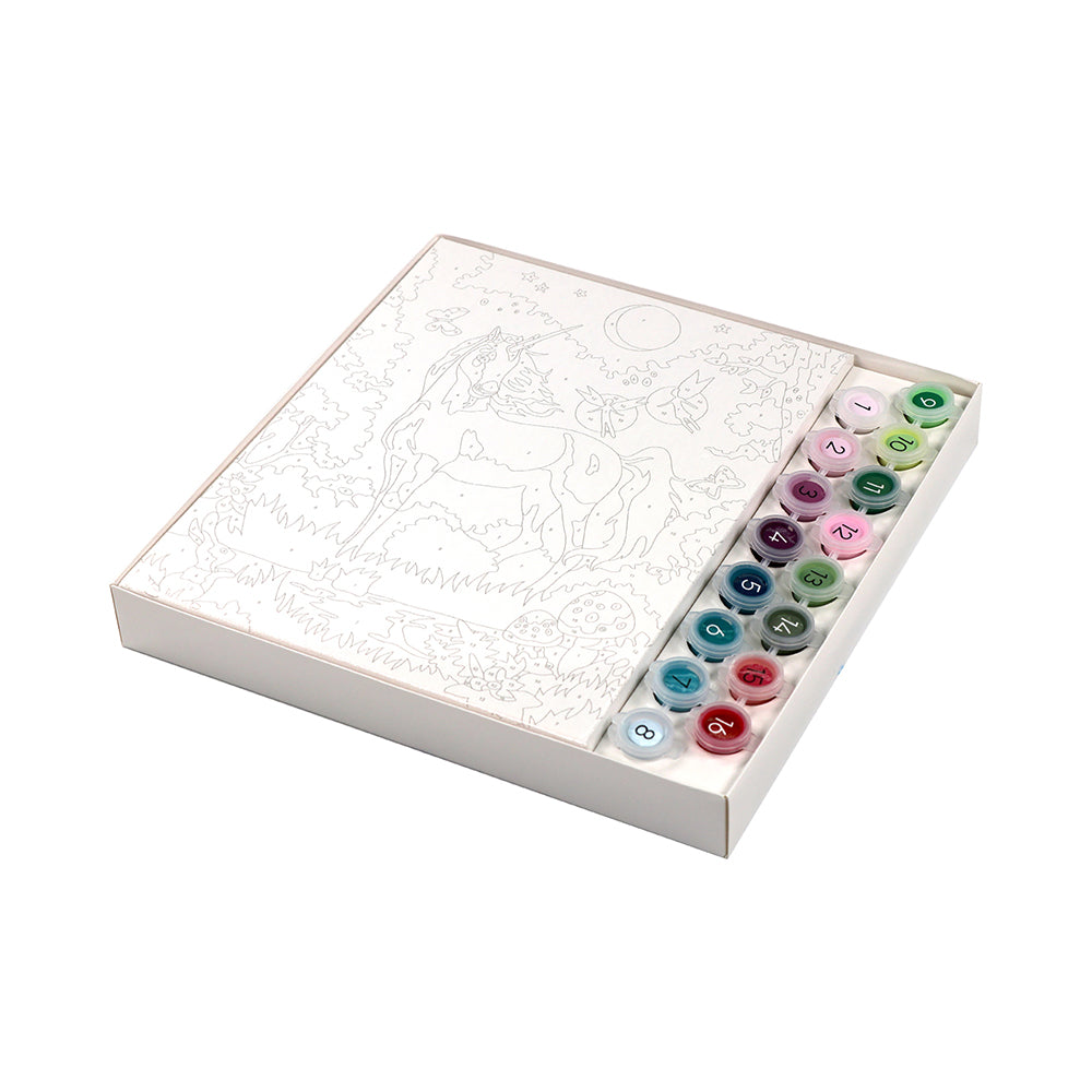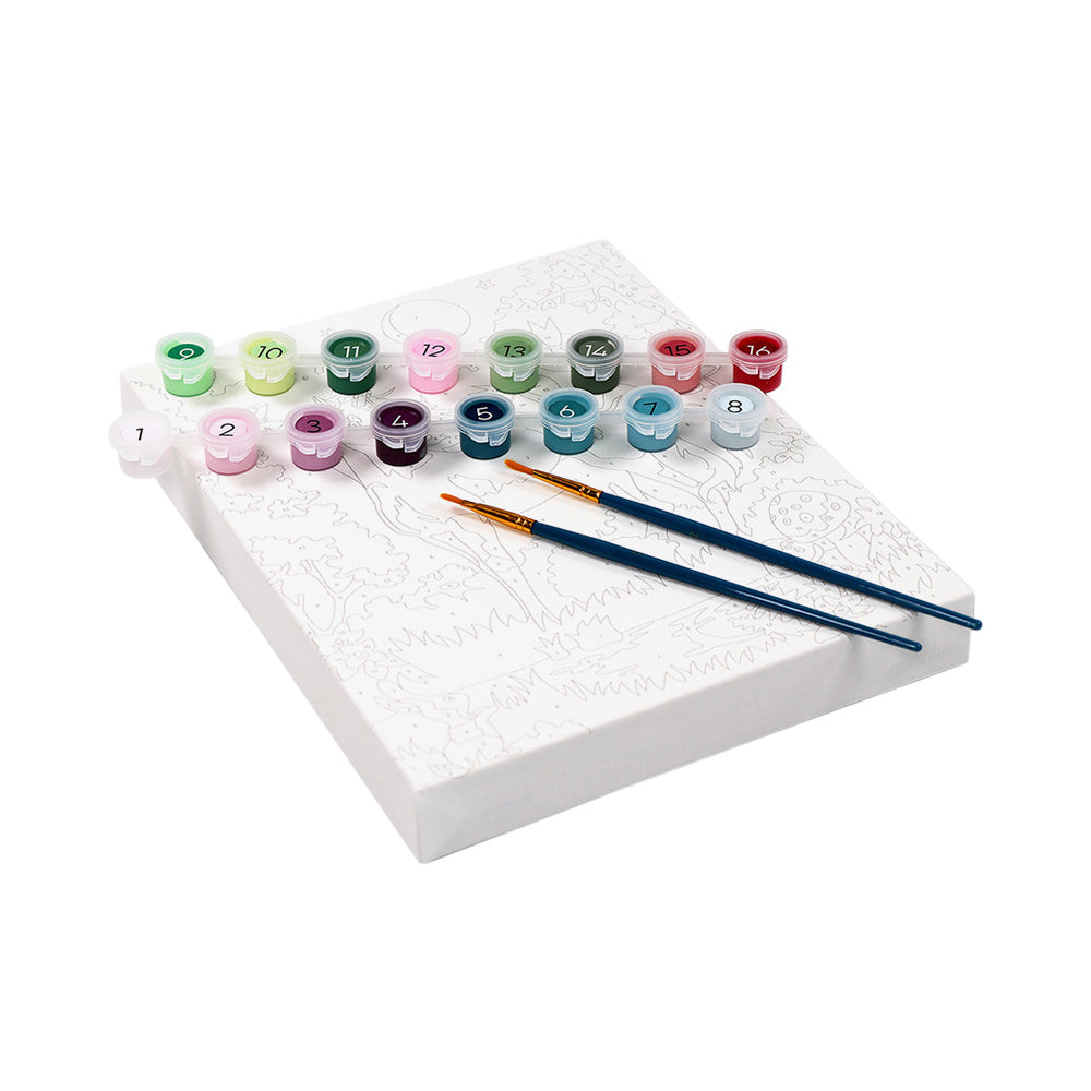 It's classic Paint By Numbers, elevated for kids 8+. 3 unique themes with beautiful artwork with enough detail to yield an impressive result. Deep canvas that can hang or stand, plus 16 colors of paint and 2 brushes. Clever tray pulls out to become your work station.