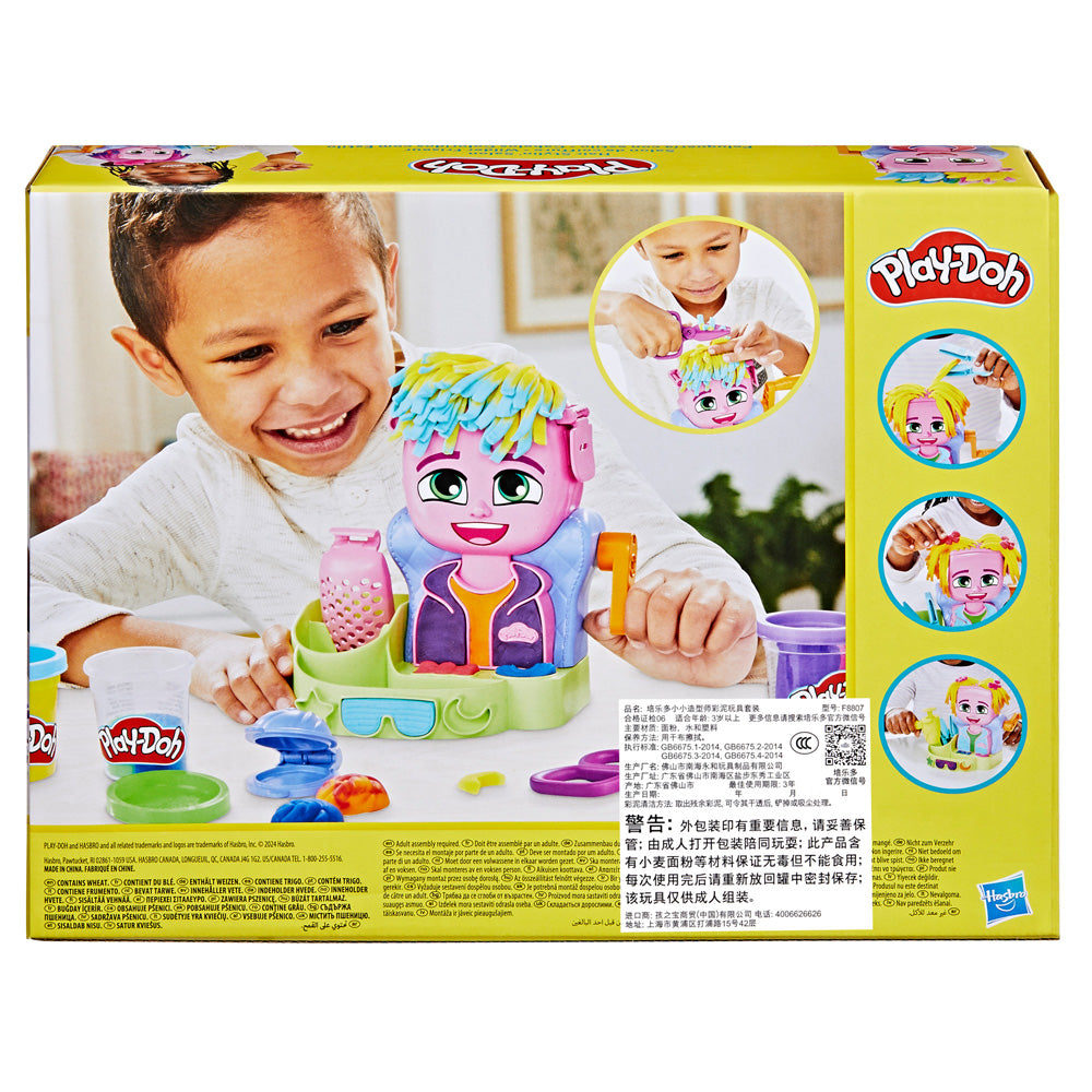 Includes playset, 2 hair plates, scissors, hair dryer extruder, crimper, mohawk mold, bun mold, clip, and 6 cans of Play-Doh Brand Modeling Compound (net weight 12 oz/340 g).