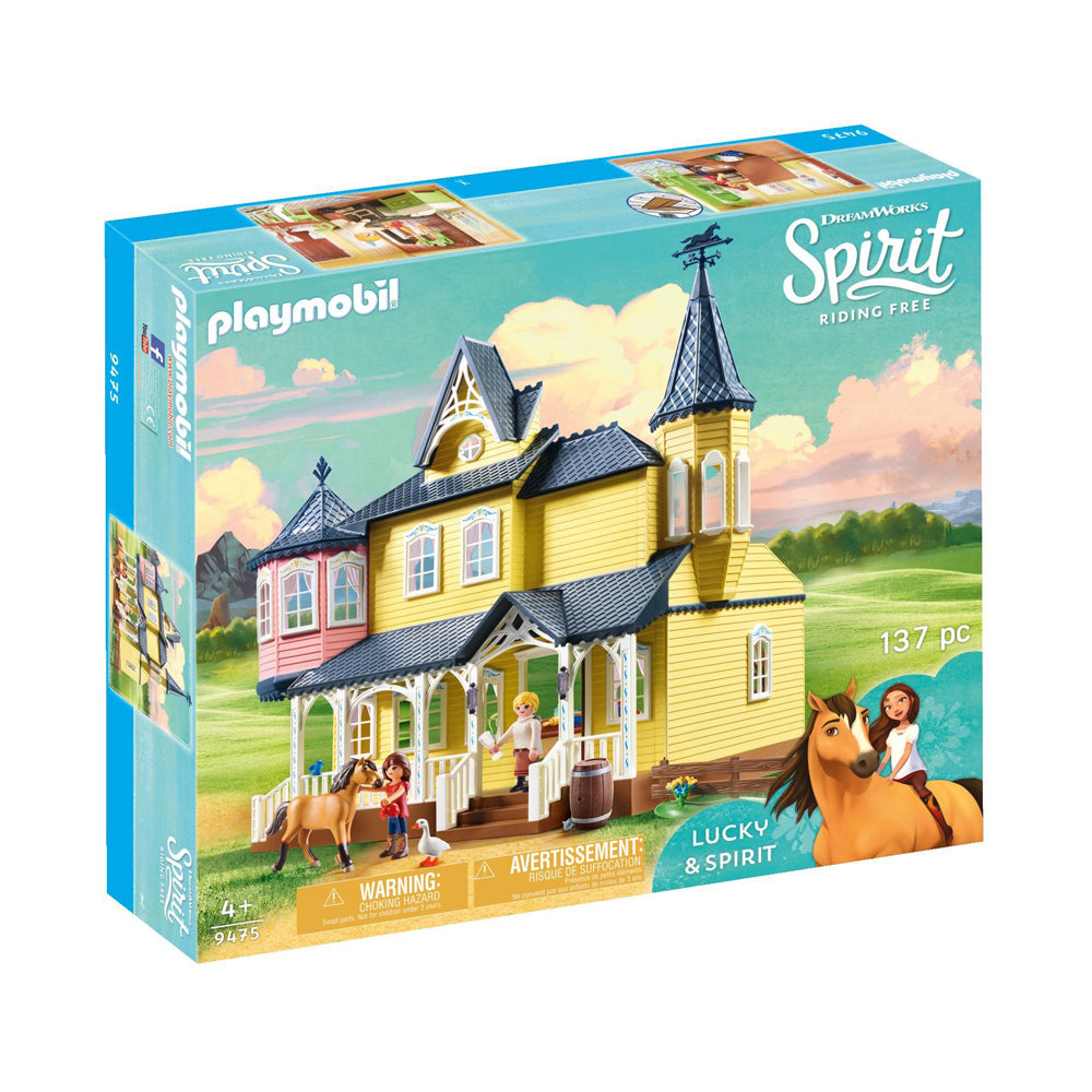 Come for a visit at Lucky's Happy Home on the frontier. Arriving in Miradero from the big city, Lucky isn't sure she will ever fit in, but this home is her safe haven. Walk into the kitchen with all the furnishings, where Aunt Cora is cooking dinner on the stove and the table is set for a delicious meal. Lucky shares all about her day's adventures, while Aunt Cora is focused on teaching Lucky etiquette and reminds her to be cautious with her wild escapades. She needs to be a proper lady, after all! Outside, Lucky visits Spirit before she heads off to school, reminding him of their upcoming adventures. Upstairs, you'll find spacious rooms for the whole family. Lucky keeps a poster of her mom in her room so she'll always remember her. Set includes large house, Lucky, Aunt Cora, Spirit, pots and pans, dishes, utensils, table and chairs, fencing, friendly goose, and lots of other accessories.