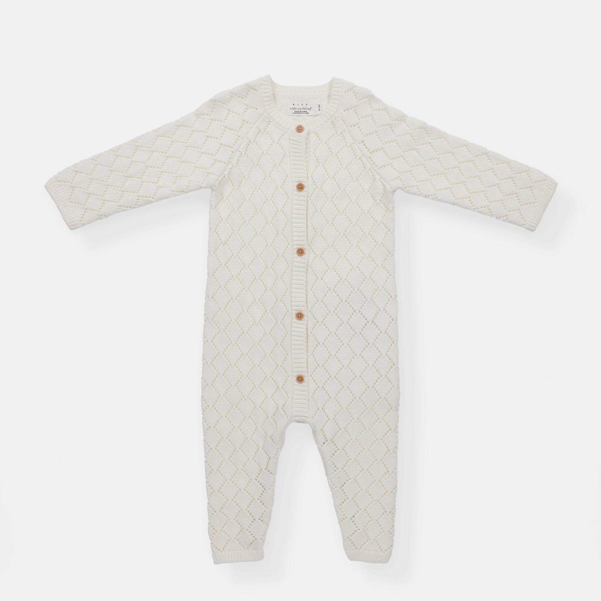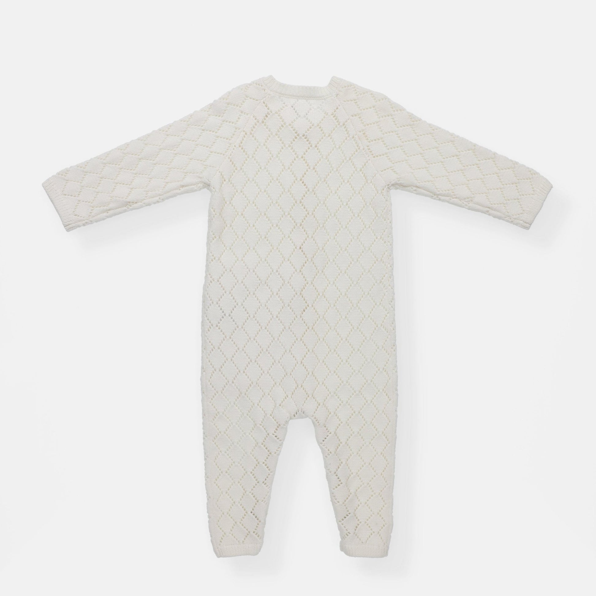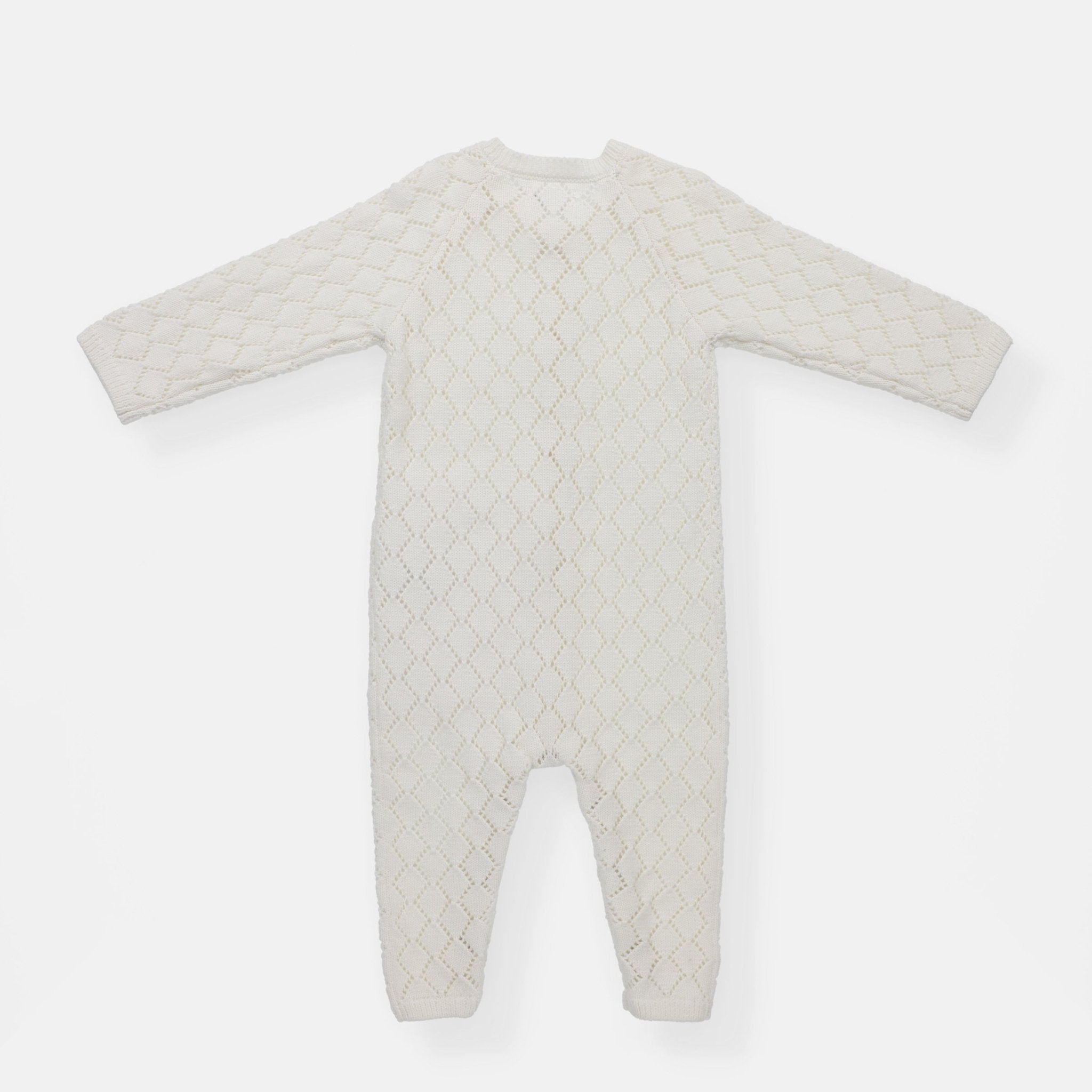 Pointelle knit jumpsuit with round neck and long sleeves.