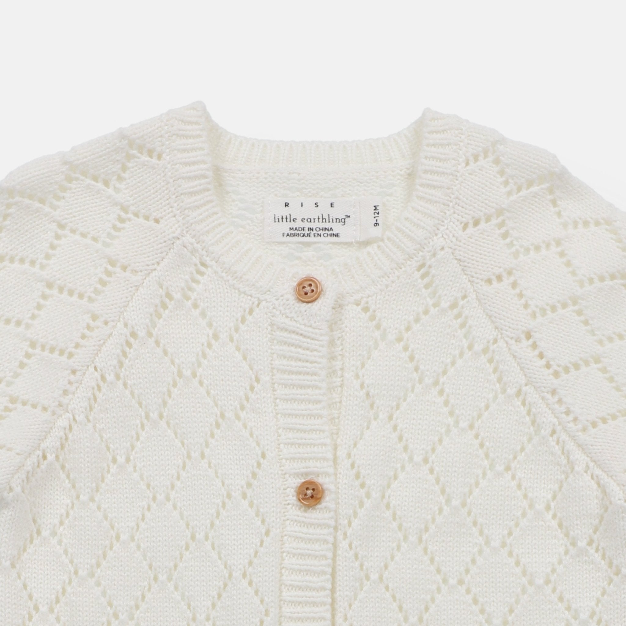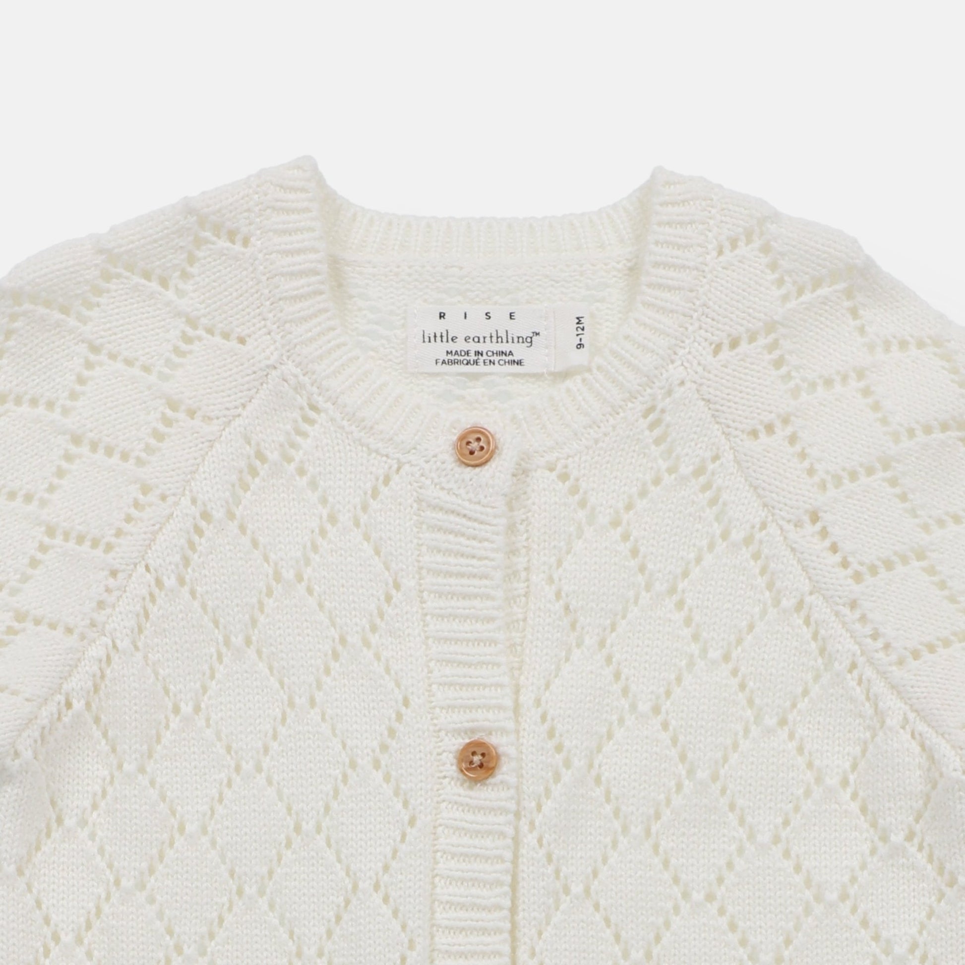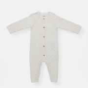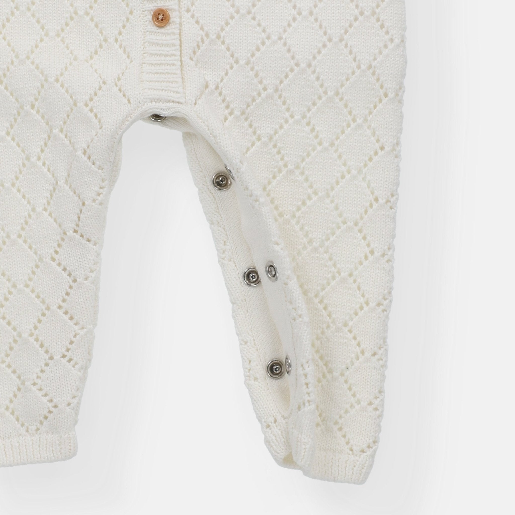 Pointelle knit jumpsuit with round neck and long sleeves.