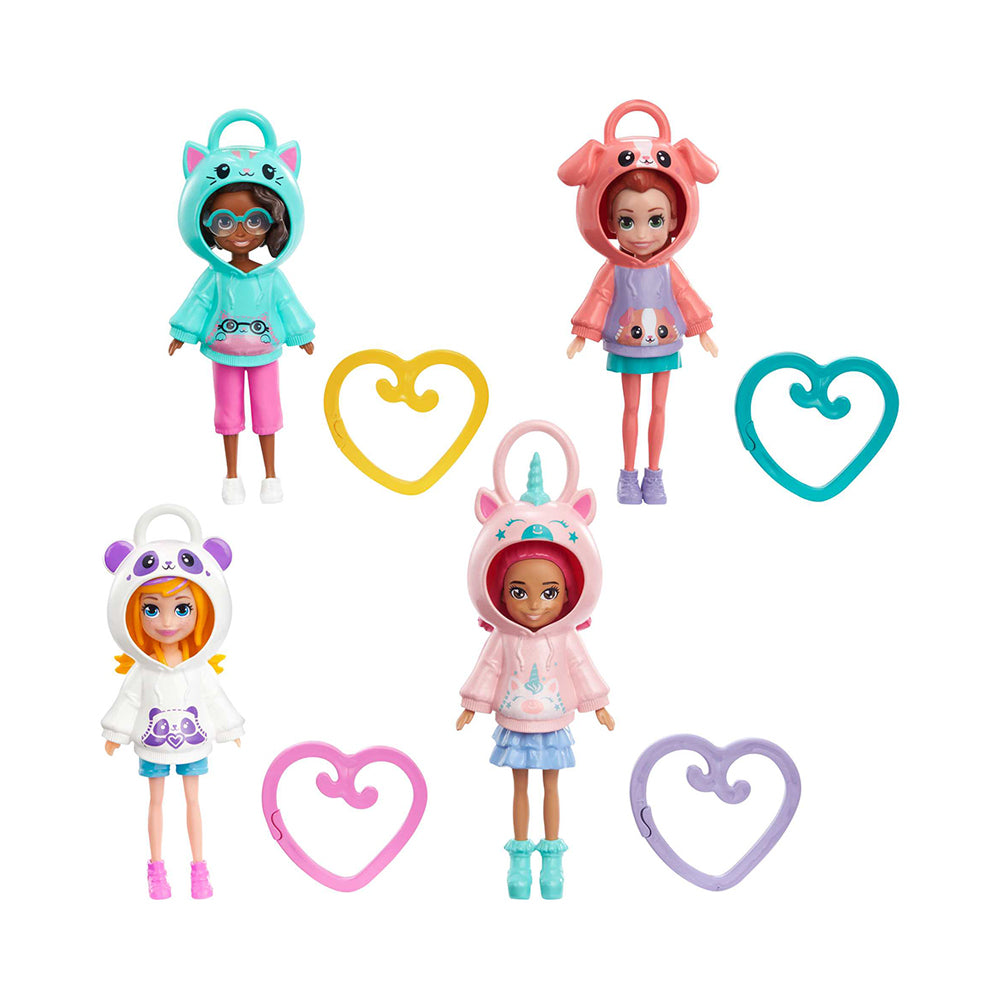 Each of these 3-inch dolls has a top with hook that can slide onto the included heart-shaped clip to take on the go. The removable outfit includes an animal-themed hoodie, colorful bottom and matching shoes. Kids can collect them all to mix, match and customize a collection. Each sold separately, subject to availability. Colors and decorations may vary.