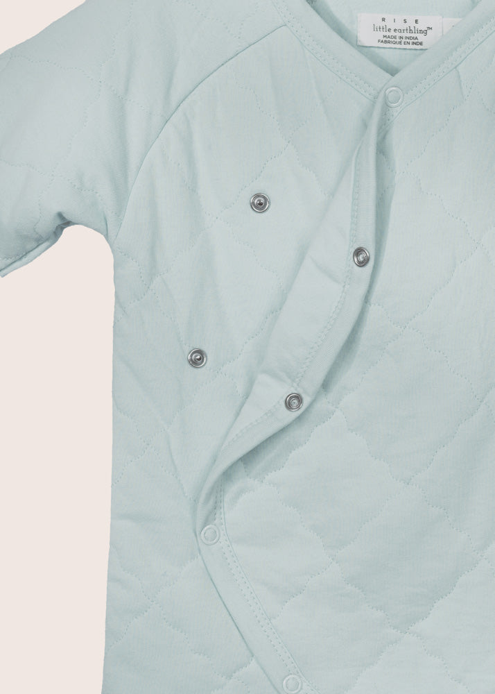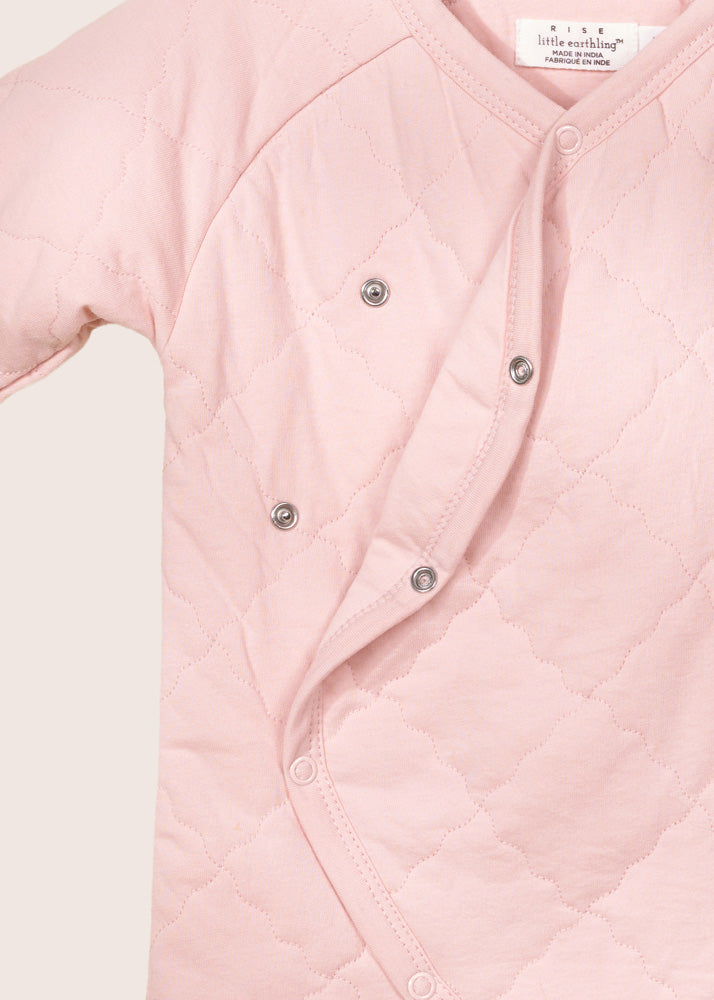Cozy quilted romper features a foldover front and a surplice neckline for added warmth and style.