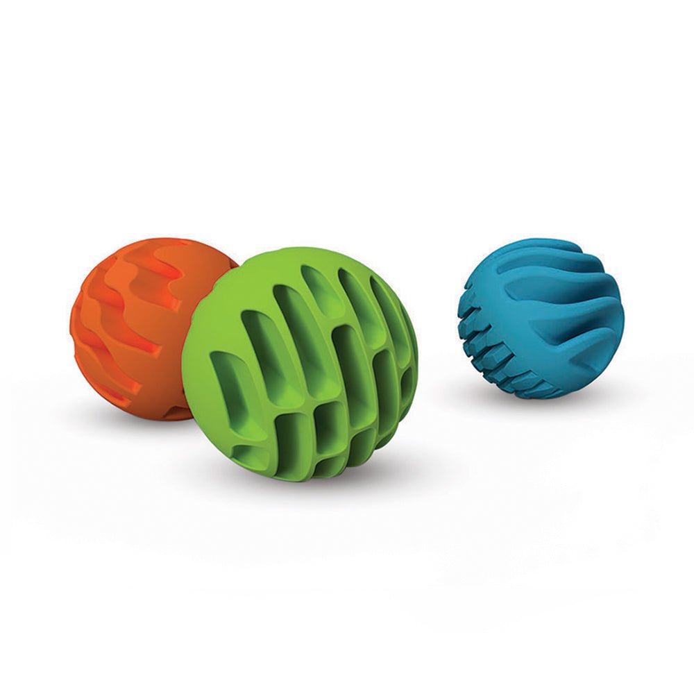 A set of 3 uniquely textured silicone spheres with beautiful chimes hidden inside that encourage sensory exploration, fine motor skills, experimentation, cause-effect learning, and imaginative play. Orange, green, and blue spheres included. Spheres measure 2.5 inches in diameter. Made of high quality food grade silicone - BPA free, safe for teething - and dishwasher safe.