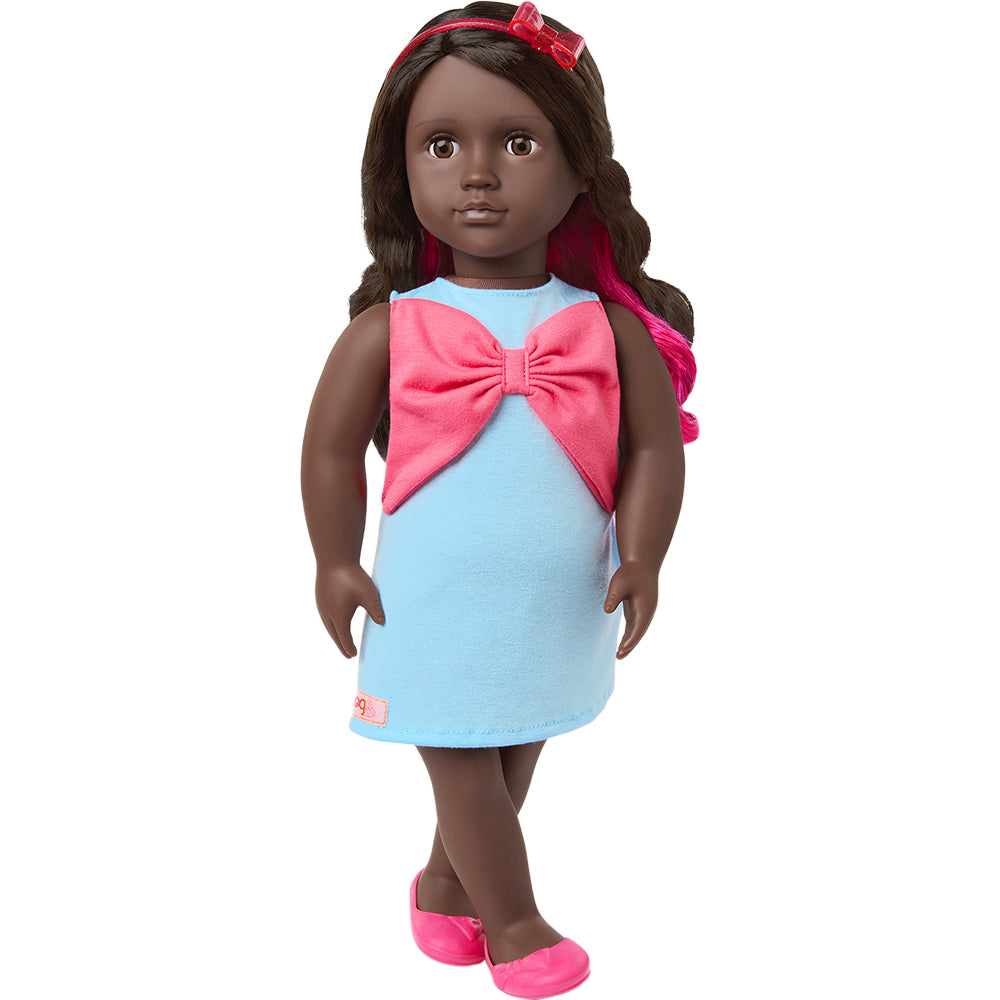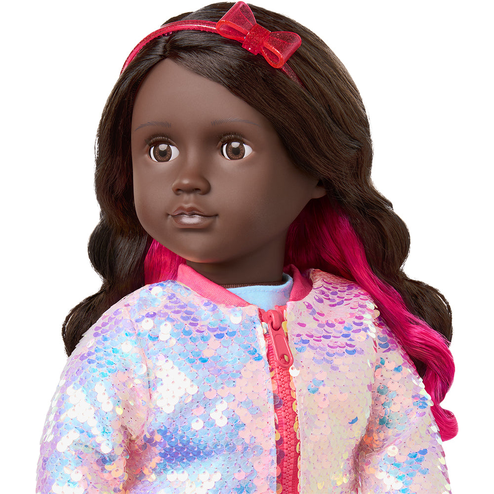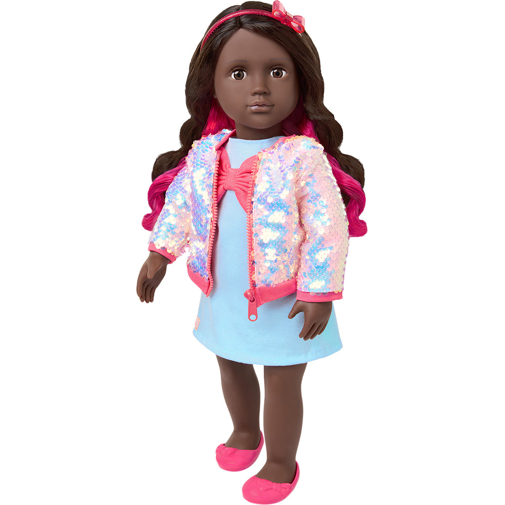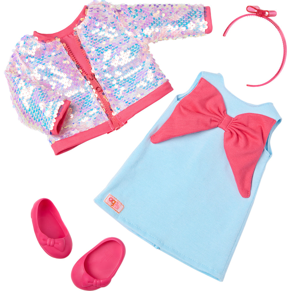 This 18-inch doll clothing set lets kids add bow-tiful styles and sweet trends to their doll's wardrobe. It includes a cute big bow dress with a matching red headband and shoes for a cute coordinated look. Plus, the zip-front sequin bomber jacket brings extra shine to every storytelling adventure! Our Generation 18-inch doll clothes make a great gift for kids ages 3+ (small parts), encouraging them to create their own unique stories. Compatible with most 18-inch dolls, doll clothes, and accessories. Our Generation dolls sold separately.