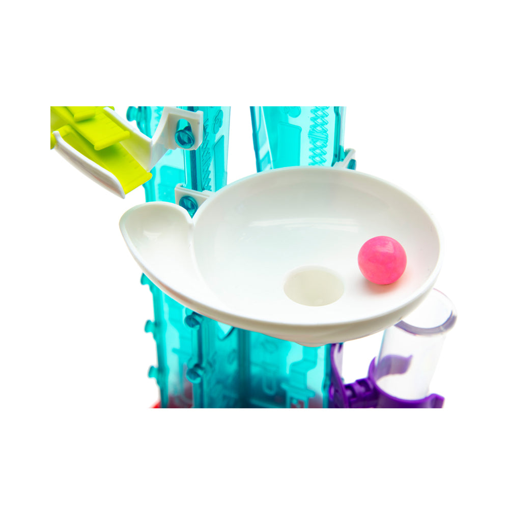 Super sweet stunts! Build your own gumball machines and learn physics lessons in the process. A turn of a handle dispenses one gumball at a time out of the clear storage globe and down the track. The gumballs land in a collection cup and can easily and sanitarily be returned to the globe for another run. The track segments can be moved around on the base to create an almost limitless number of different gumball machines. As the gumballs roll down the track, they perform cool stunts and tricks. Stunts include a pulley lift, pendulum, funnel, trampoline, variable-slope ramp, pinball launcher, and domino slide. Each segment of the track teaches a different lesson in mechanical physics, allowing users to explore topics including simple machines, momentum, force, motion, gravity, Newton's laws, and more. Will your gumball successfully make it to the end of the track, or will you have to reengineer your gumball machine to make it work? Includes a small supply of gumballs to get started.