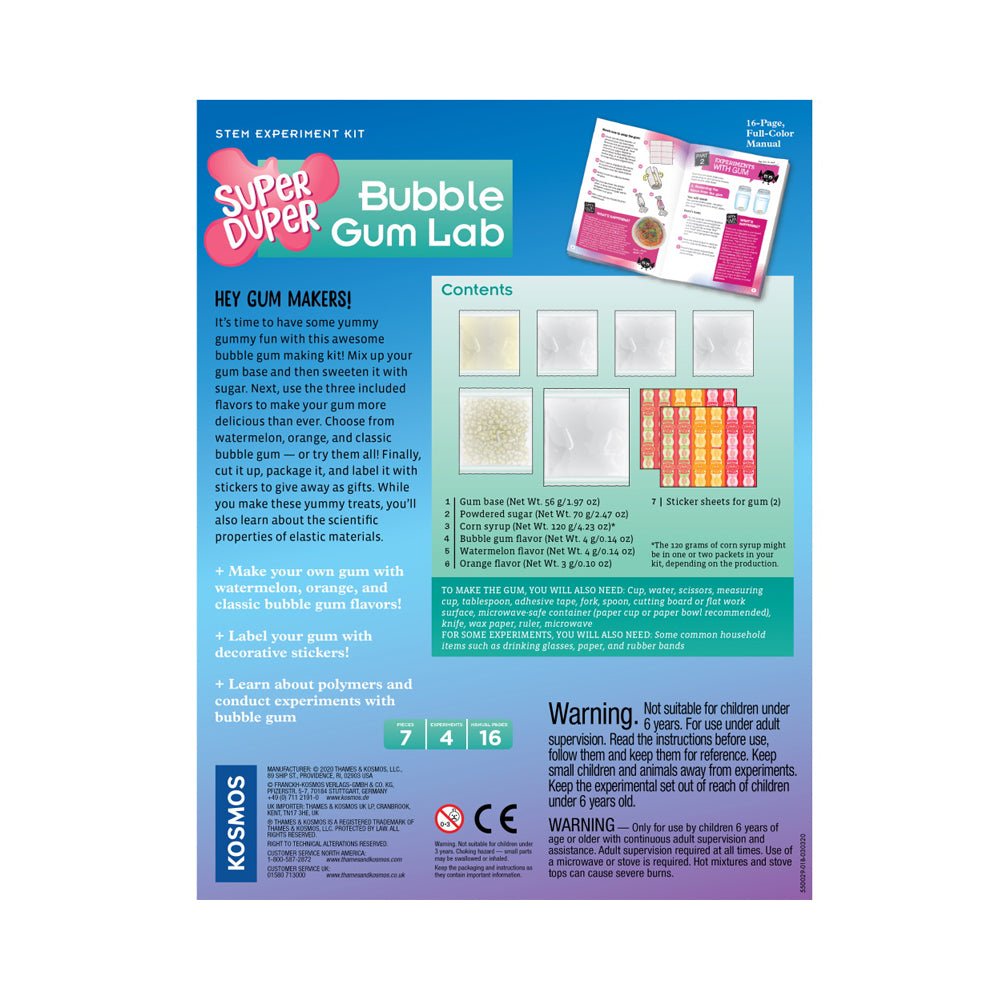 It's time to have some yummy gummy fun with this awesome bubble gum making kit! Mix up your gum base and then sweeten it with sugar. Next, use the three included flavors to make your gum more delicious than ever. Choose from watermelon, orange, and classic bubble gum ?€? or try them all! Finally, cut it up, package it, and label it with stickers to give away as gifts. While you make these yummy treats, you'll also learn about the scientific properties of elastic materials. Food ingredients included.