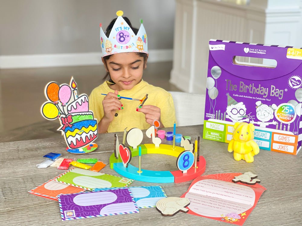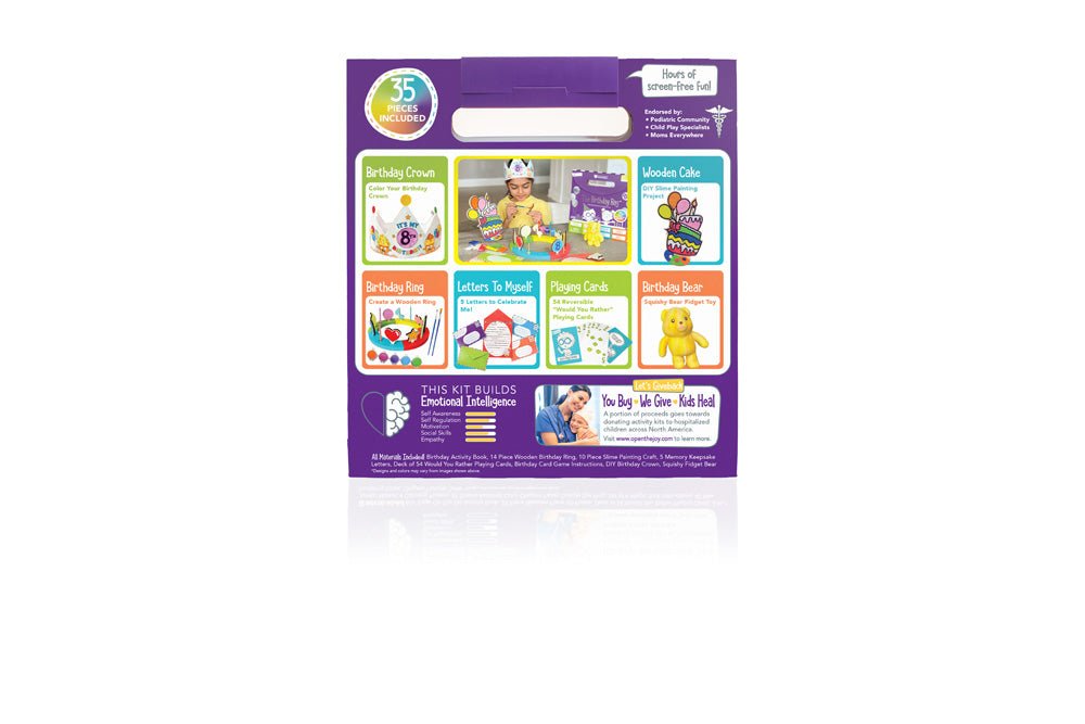 Includes an activity book, a DIY crown, a wooden cake to paint with foam slime, 5 "letters to myself", a deck of playing cards, a birthday bear, a 14 piece wooden Birthday Ring, paints and a birthday game.