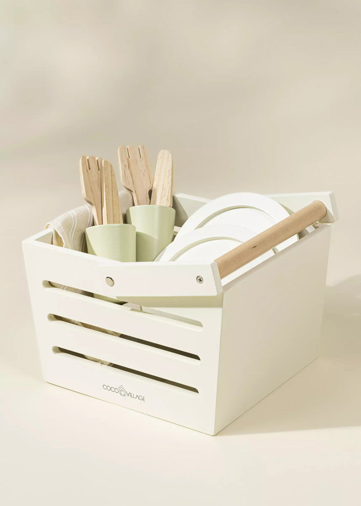 Thanks to its elegant basket and a complete range of accessories, the Wooden Picnic Playset and Accessories sparks the creativity of toddlers. It provides them with the opportunity to bring captivating stories to life during their imaginary outdoor and indoor adventures!